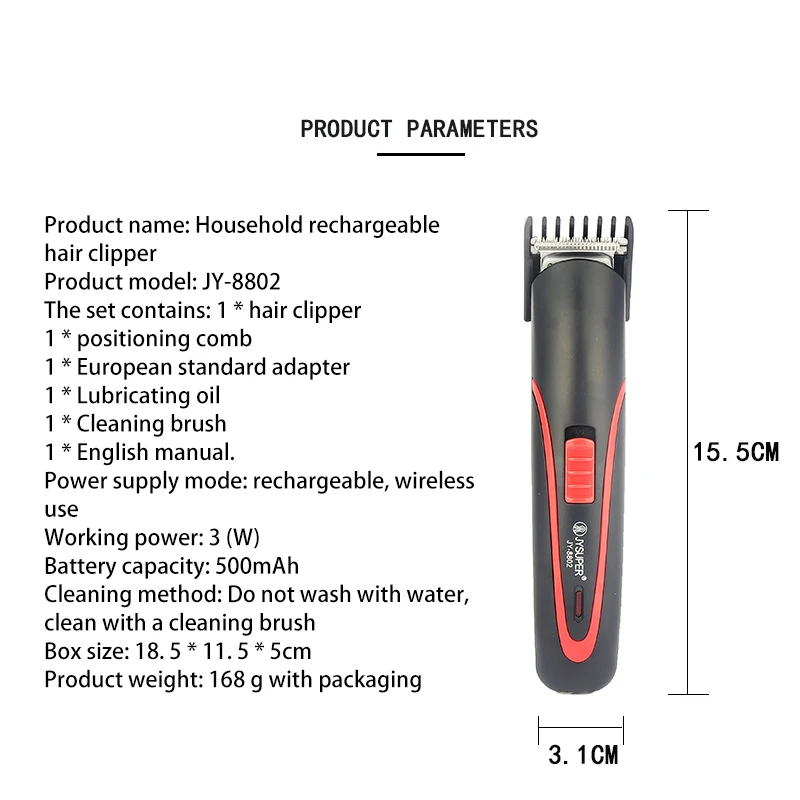 110В-240В напряжение, 50/60 Гц Дизайн аккумуляторной батареи, он не будет работать после удаления батареи Аккумулятор Ni-cd Aa 600 мАч Профессиональный парикмахерский инструмент, или для домашнего использования Напоминание индикатора зарядки Направляющая расческа регулируется от 3 до 6 мм Точное лезвие, Ширина 30 мм 8 часов зарядки Время работы более 60 минут