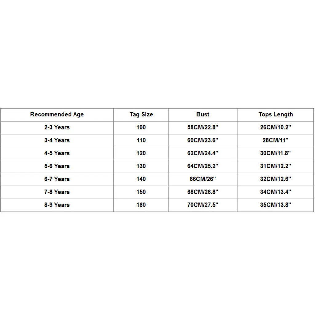 Рекомендуемый возраст Размер бирки Бюст Длина топа От 2 до 3 лет 100 58 см/22,8" 26 см/10,2" От 3 до 4 лет 110 60 см/23,6" 28 см/11" От 4 до 5 лет 120 62 см/24,4" 30 см/11,8" От 5 до 6 лет 130 64 см/25,2" 31 см/12,2" От 6 до 7 лет 140 66 см/26" 32 см/12,6" От 7 до 8 лет 150 68 см/26,8" 34 см/13,4 дюйма От 8 до 9 лет 160 70 см/27,5" 35 см/13,8"