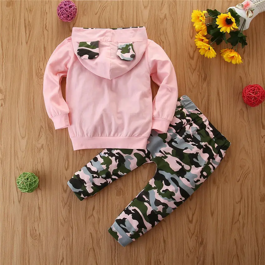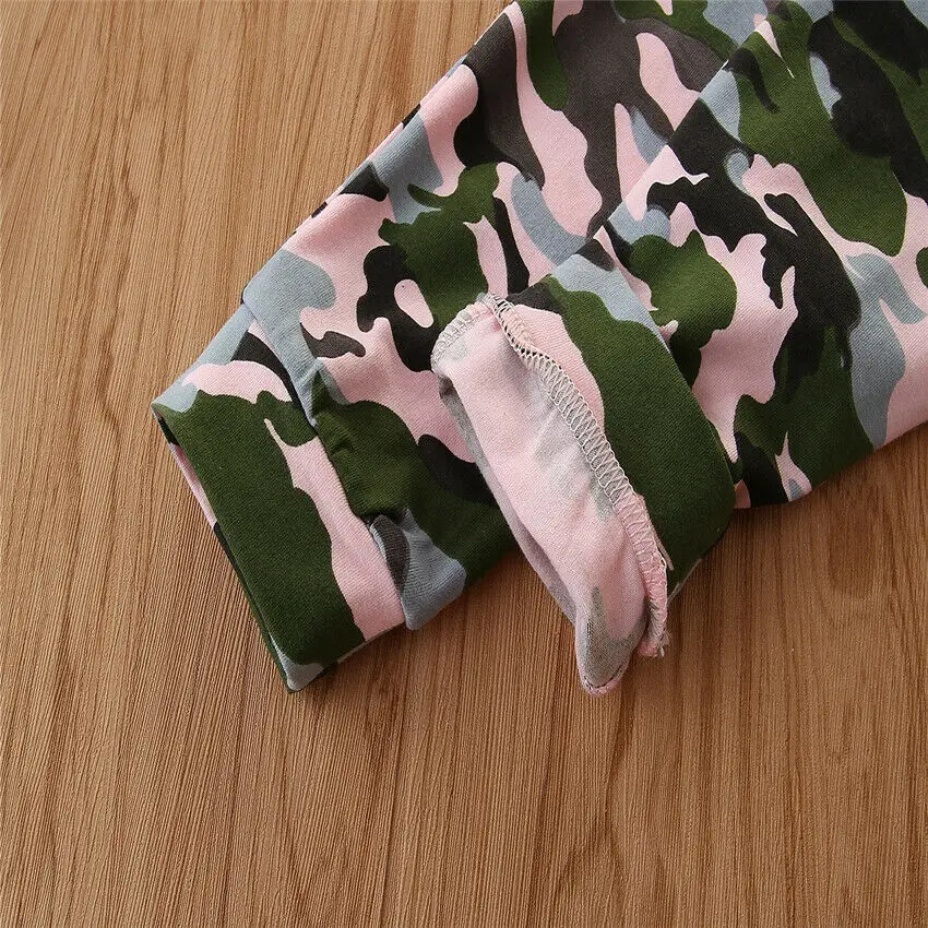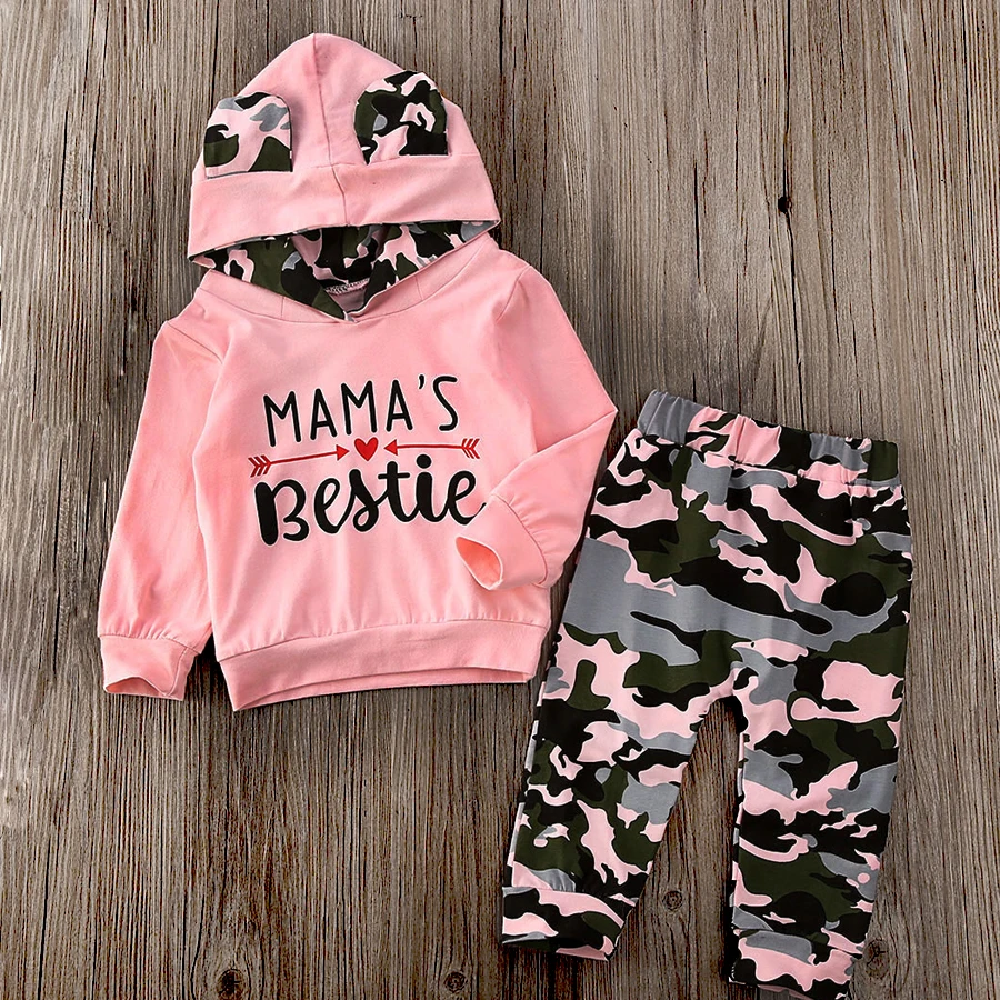 Качество на первом месте и самый лучший сервис. Все покупатели — наши друзья. Модный дизайн, 100% новый бренд, высокое качество! 2020 Весна новое поступление Комплект одежды для маленьких мальчиков и девочекСпортивный костюм Розовый топ с капюшоном и буквенным принтом; Длинные камуфляжные штаны Материал: Смешанный хлопокРазмеры таблицей: