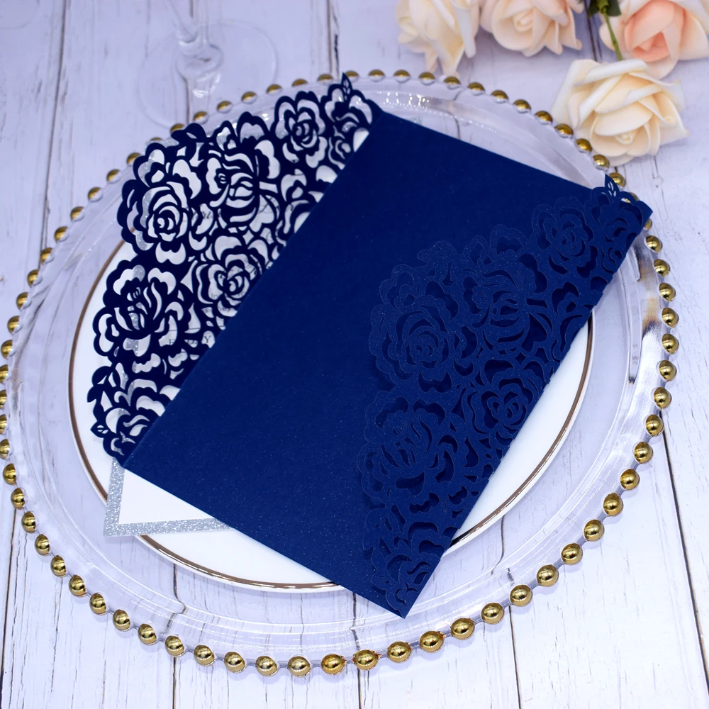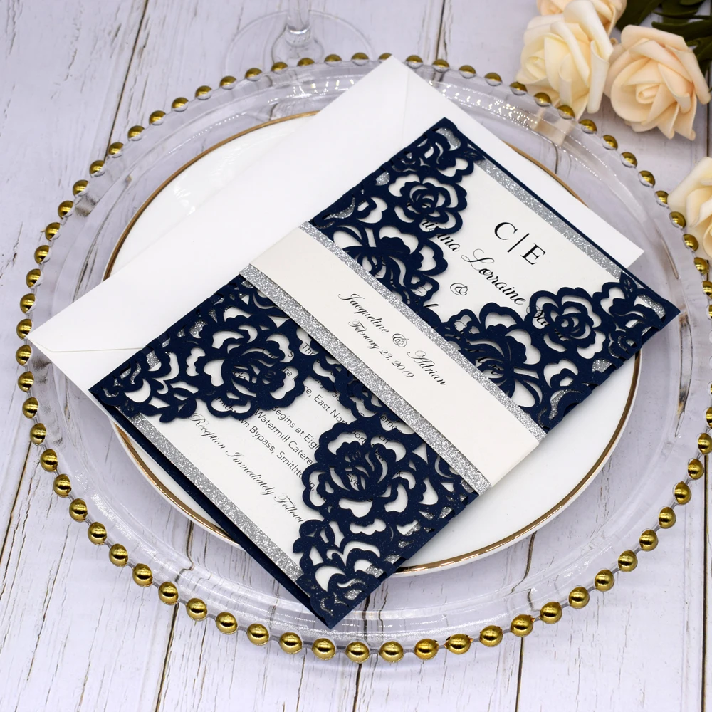 50 шт. Темно-Синий Серебряный Блестящий низ роза цветочные свадебные приглашения с лентой для живота