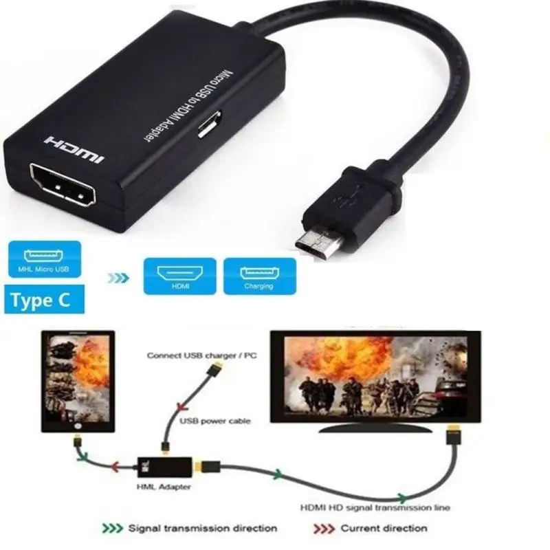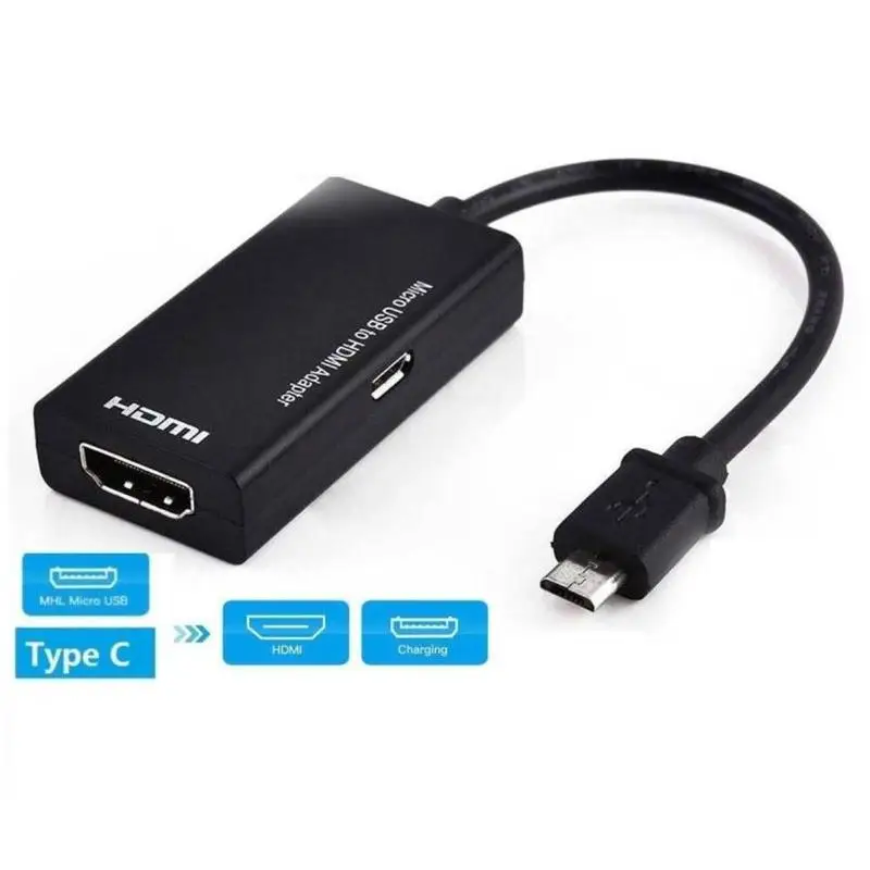 Подключите микро USB 5-контактный разъем с портом USB-C на HDMI-совместимость (type A) устройства. Поддерживает все аудио/видео разрешения, включая 1080p.