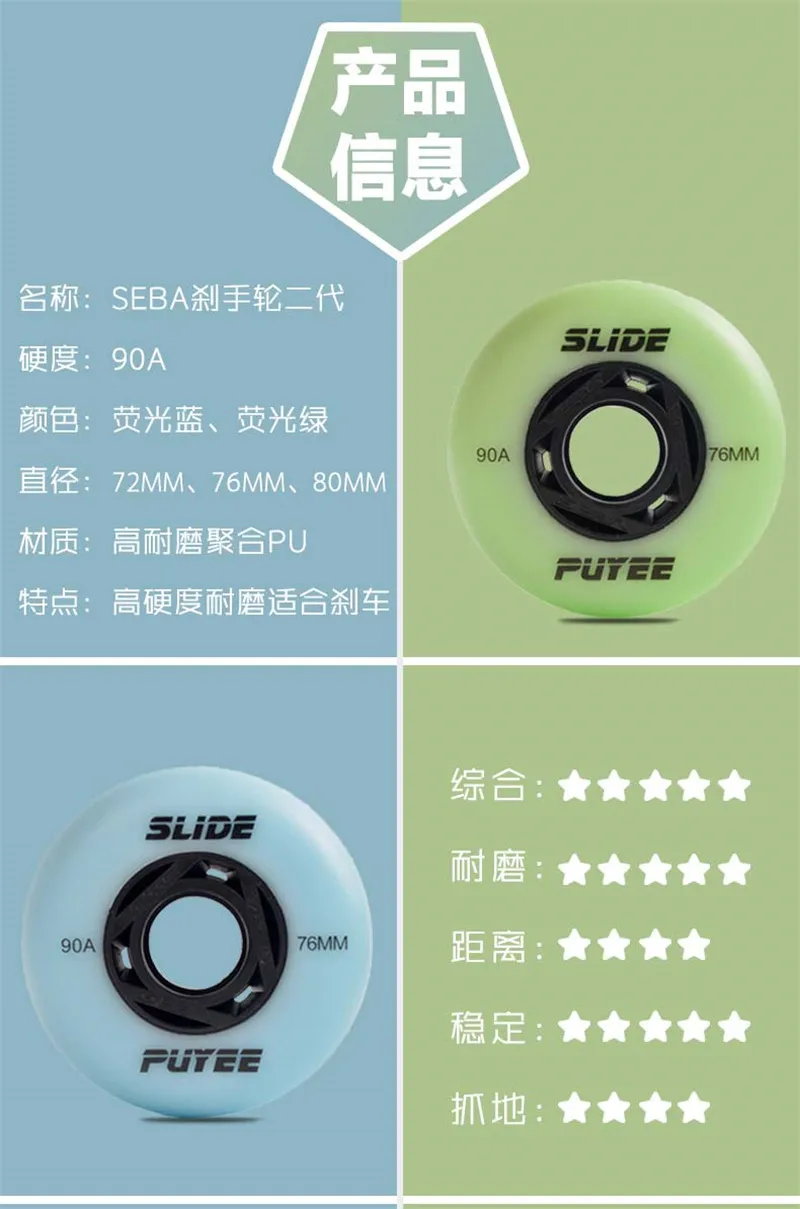 1. Зеленый, синий 2. Размеры 72 мм, 76 мм, 80 мм 3. 90A твердость 5. Подходит для катания на скользящих коньках