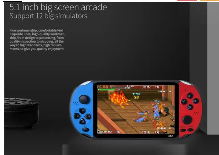 5,1-дюймовый X12 экран двойной рокер мини портативная игровая консоль ностальгические Детские Ретро игры Мини семья ТВ Видео консоли Особенности: 1. Большой объем памяти 8 Гб, встроенный 3000 + классические игры 2. Поддержка 32-битных загрузок игр, поддержка 16-битной игры, поддержка 8-битной игры downloa 3,1250 миллиампер батареи, непрерывное использование 3 ~ 5 часов 4. Экран 5,1 дюйма, экран HD 1080*720 5. Поддержка видео формата RMVB/MP4/3GP 6. Поддержка AV телевизионного выхода 7. Поддержка воспроизведения фильмов, видеокамер, игр, фотографирования, электронных книг, MP3, просмотра изображений, расширенных карт памяти TFT Посылка включает в себя: 1 x игровая консоль 1 х Наушники 1 кабель для передачи данных
