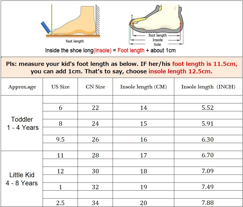 2. Что касается размера, Измерьте длину стопы ребенка в см или дюймах + 1 см или 0,03937 дюймаChВыберите соответствующий американский размер, спасибо.