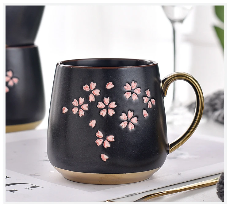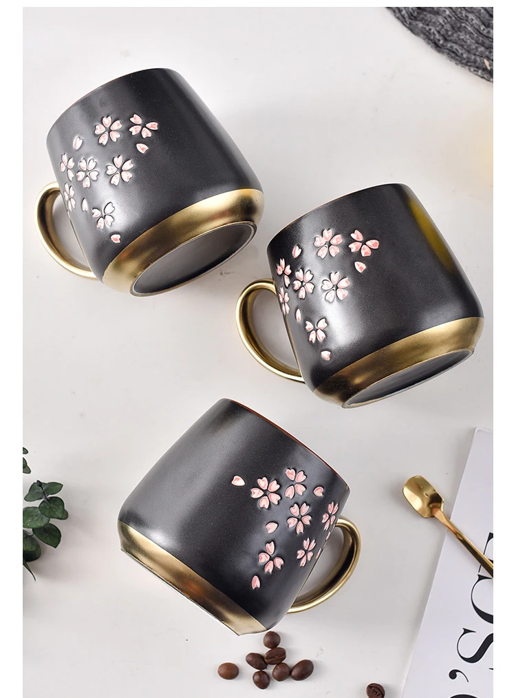 Черная Керамическая кофейная кружка с Сакурой чайная чашка с золотой и золотой ручкой креативный фарфор в подарок с ложкой