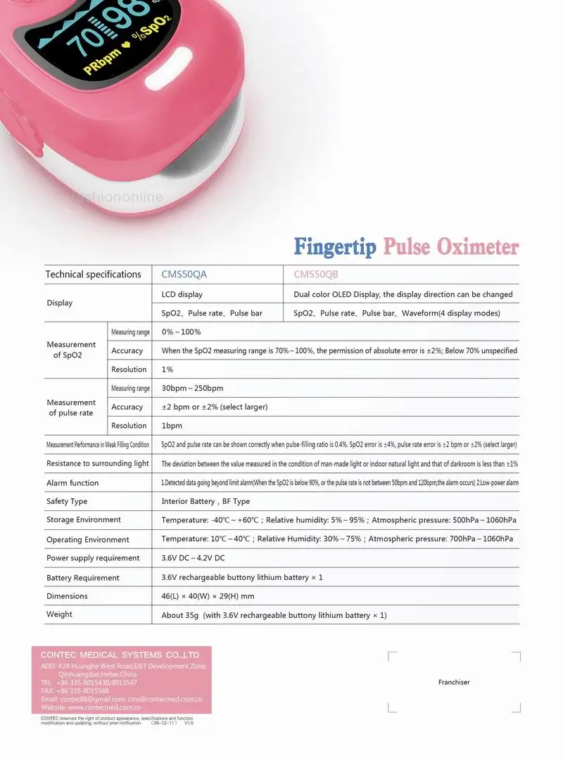 Введение Принцип пульсоксиметра CMS50QB заключается в следующем: фотоэлектрическая технология контроля оксигемоглобина используется в соответствии с технологией импульсного сканирования и записи емкости, пульсоксиметр может использоваться для измерения насыщения пульса кислородом и частоты пульса через палец. Продукт подходит для использования в семейных, больничных, кислородных, общественных медицинских, Физический уход в спорте (его можно использовать до или после занятий спортом, и не рекомендуется использовать устройство в процессе занятий спортом) и т. Д. Основные характеристики ■Интегрирован с SpO2 зондом и модуль обработки дисплея ■Малый объем, светильник весит и удобен в переноске ■Работа продукта проста, низкое энергопотребление ■ SpO2 значение дисплея ■Отображение значения пульса, отображение гистограммы ■Pulse отображения сигнала ■Режим отображения может быть изменен ■С измеренными ограничениями превышения данных и функцией будильника низкого напряжения ■ Индикация низкого напряжения: Индикатор низкого напряжения появляется перед началом работы, что происходит из-за низкого напряжения ■Маленький внешний вид, больше подходит для детей