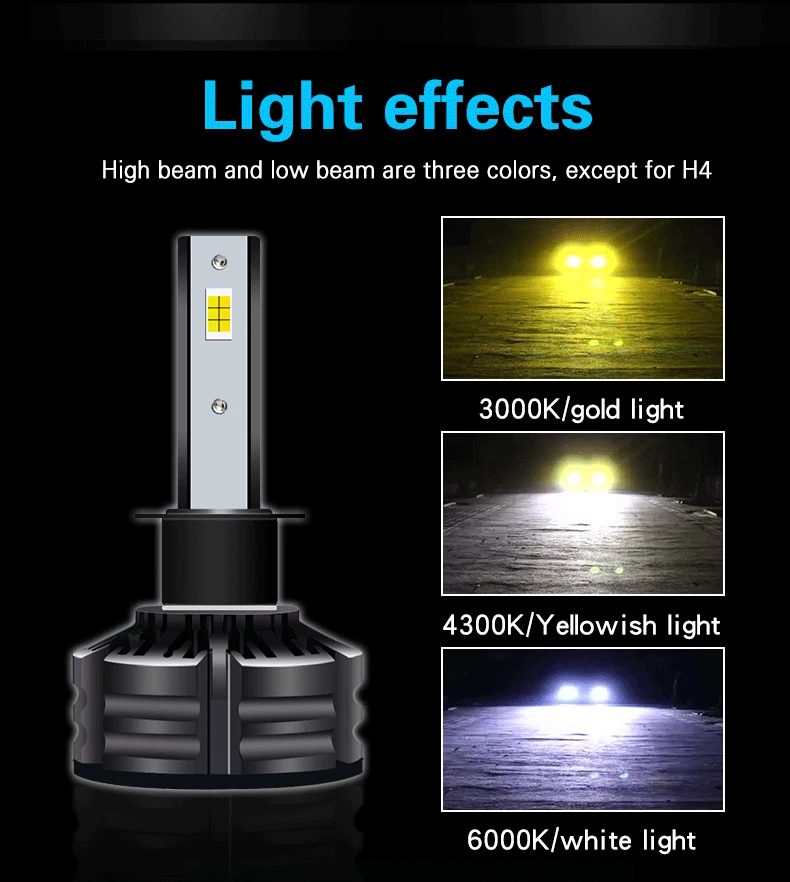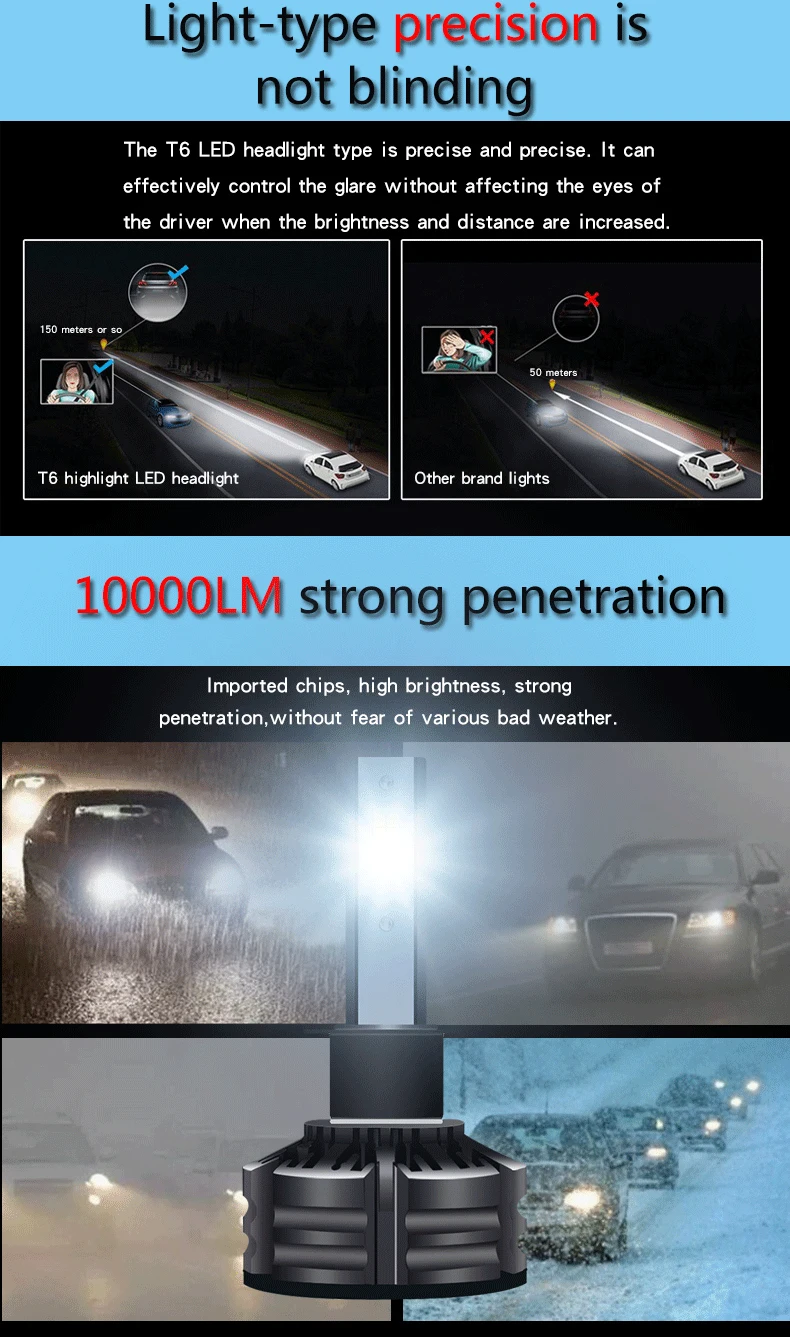 T6 Трехцветная яркая светодиодная фара Основные параметры 1. Напряжение: 12 V-24 V 2. Чип: ZES 3. Мощность: 60 Вт/пара 4. Люмен: 10000лм/пара 5. Цветовая температура: 3000 k 4300 k 6000 K 6. Водонепроницаемость: IP67 7. Охлаждение: алюминиевая Колонка охлаждения 8. Срок службы: более 30000 часов 9. Гарантия: 2 года