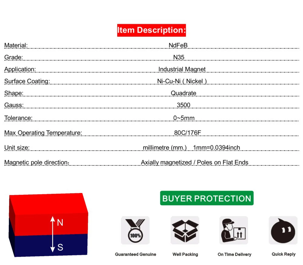 Уведомления: 1. Из-за особой природы магнита и искусственного измерения. Фактические размеры зависят от физических измерений. 2. Магнит имеет широкий спектр применения. Идеально подходит для наклеивания заметок на двери холодильника. Фиксация белой доски, адсорбция различных стальных деталей, фиксация тканевой коробки на крыше, идеально подходит для проектов DIY и т. д. потому что Большой Супер магнитный, не позволяйте ребенку прикоснуться к ней. 3. Сопутствующие электронные продукты, такие как механические часы, банковские карты, мобильные телефоны, компьютеры, телевизоры, кардиостимуляторы и т. Д., на них легко влияют неодимовые магниты, пожалуйста, сохраняйте определенное расстояние, чтобы избежать ненужных потерь. 4. Магниты NdFeB хрупкие, характеристики жесткие и ломкие, особенно изделия большого размера, полоски и тонкие ломтики, отделяют магнит, пожалуйста, осторожно сдвиньте в шахматном порядке, не должны сломать твердый поднос, чтобы не повредить продукт или травмировать, отделены для поддержания определенного расстояния, Чтобы не касаться столкновения, повреждения продукта или даже опасности. 5. Неодимовые магниты обычно покрыты никелем-медью-никелем для предотвращения ржавчины железа. Если не используется во времени, обязательно Держите подальше от высокой температуры и коррозионной среды, хотя на поверхности магнита есть покрытие. 6. Если у вас есть какие-либо вопросы, пожалуйста, свяжитесь с нами.