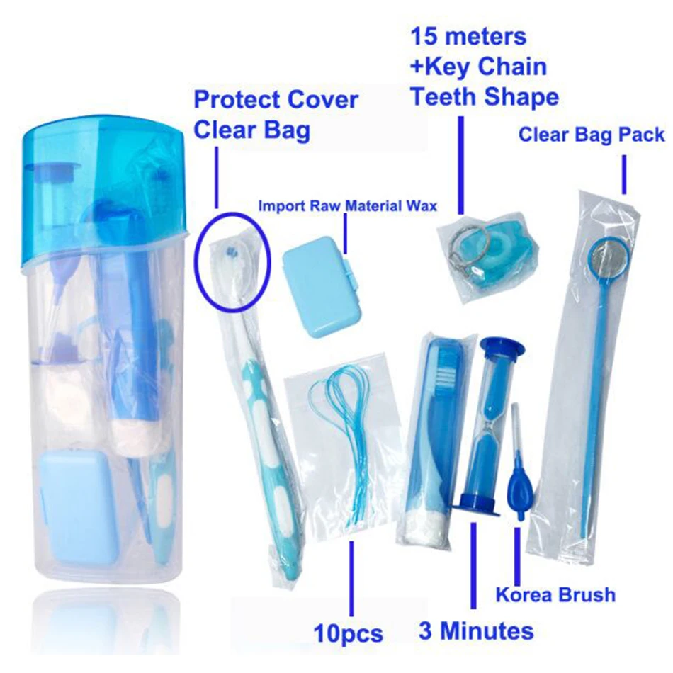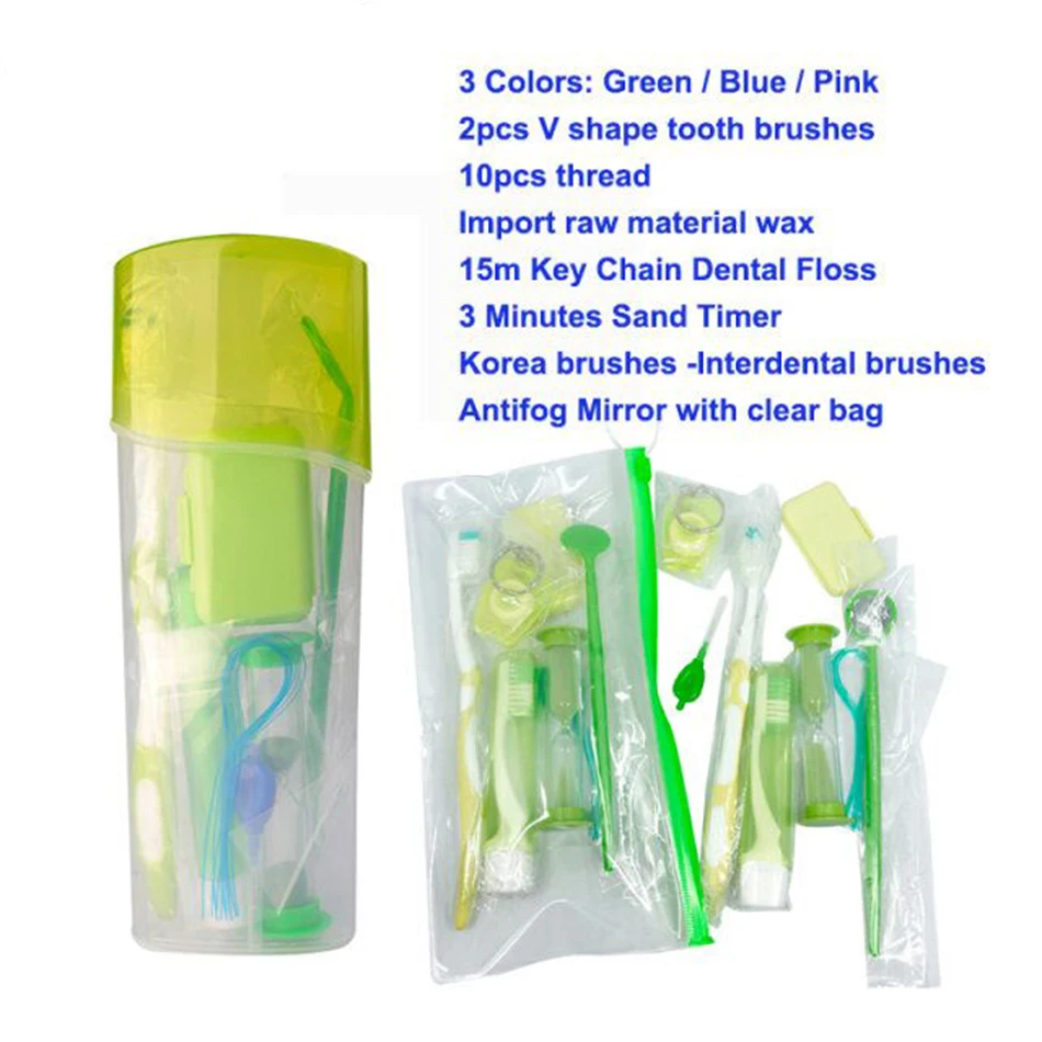 1 складные зубные щетки v-образной формы, 1 прямая v-образная форма зубных щеток, 1 шт. 3 минуты песочный таймер, 1 коробка высокого качества с фруктовым запахом стоматологический воск пациента, 1 шт. 15 метров зубная нить с Мятным запахом 10 шт. зубной нити 1 шт. корейские щетки межзубные щетки 1 шт. Стоматологическое оральное зеркало