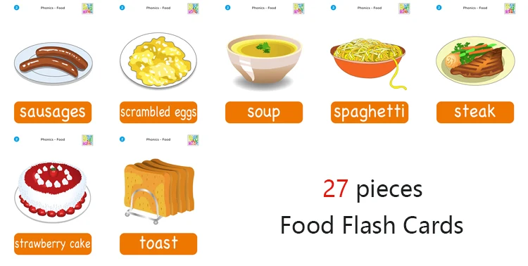 Описание продукта: Название: Английская открытка Возраст:> 2 года Материал: двустороннее защитное пластиковое уплотнение, водонепроницаемый, анти-складывание и обработка филе без царапин Узор: Еда Размеры: 11 см * 16 см Посылка: 27 шт./компл. Особенности: Милые учебные материалы для обучения ребенка английским словами. Phonics-это удобный для детей метод обучения, который поставляется из англоязычных стран. Phonics-это фонетическая система для детей, обучающих английскому говорению, подходящая для детей. Его основой является создание соответствия между буквами и звуками. Без помощи Фонетических Символов буквы могут быть прочитаны непосредственно, чтобы произносить слово, чтобы решить проблему, что слова не могут быть прочитаны и не могут быть написаны. Фотографии: