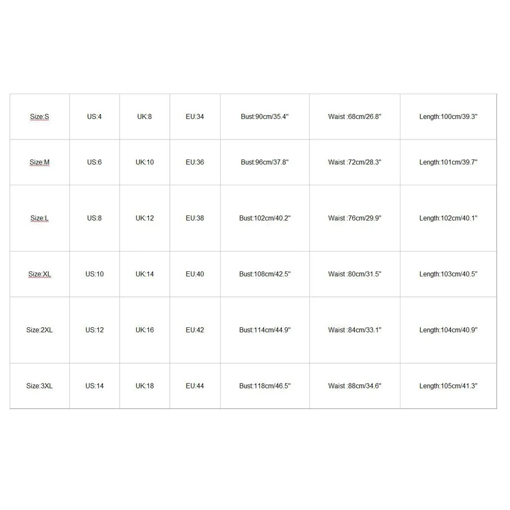 Размер США Великобритания ЕС Бюст Талия Длина S 4 8 34 90 см/35,4" 68 см/26,8'' 100 см/39,3'' М 6 10 36 96 см/37,8" 72 см/28,3'' 101 см/39,7'' L 8 12 38 102 см/40,2" 76 см/29,9'' 102 см/40,1'' XL 10 14 40 108 см/42,5" 80 см/31,5'' 103 см/40,5'' 2XL 12 16 42 114 см/44,9" 84 см/33,1'' 104 см/40,9'' 3XL 14 18 44 118 см/46,5" 88 см/34,6" 105 см/41,3''