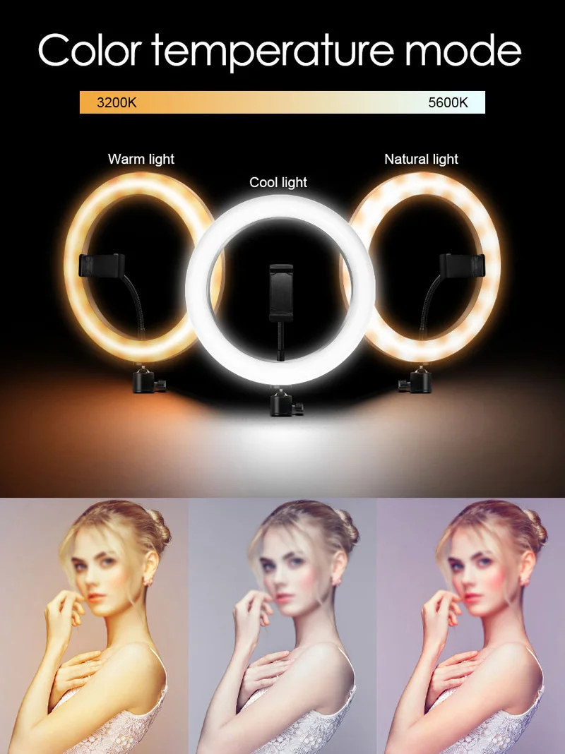 Технические характеристики: Наружный диаметр кольцевой лампы: 26 см/10 дюймов Лампы: 48 холодный светильник, 48 теплый светильник, 48 RGB светильник Цветовая температура: 3200K-5600K plus RGB Световой поток: 1200W Мощность: 10 Вт Напряжение: 5V Светильник Материал корпуса кольца: поликарбонат Длина кабеля USB: 2 метра Штатив: термоусадочный размер 43 см Максимальная высота: 130 см Штатив + кольцевой светильник Максимальная рабочая высота: 160 см Набор: RGB заполняющий светильник * 1 штатив * 1 мобильный телефон клип * 1