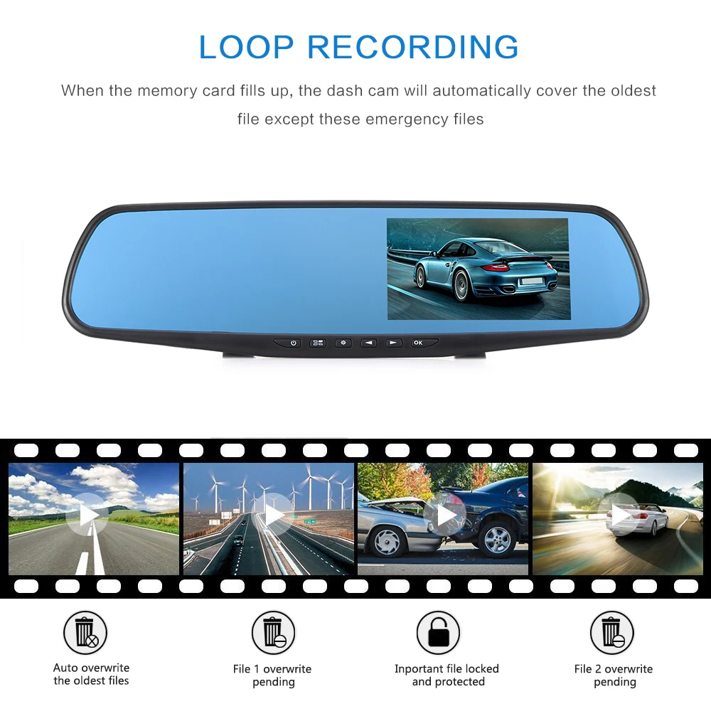 Поддержка сегментов 1/3/5 минут в соответствии с вашими настройками. Когда карта памяти заполняется, dash cam автоматически закроет самый старый файл, за исключением этих аварийных файлов.