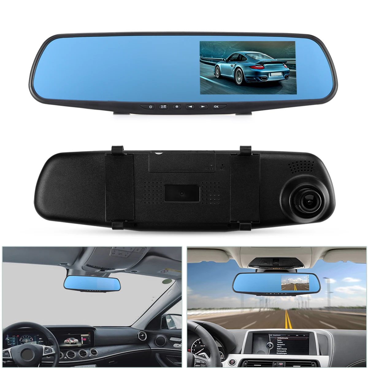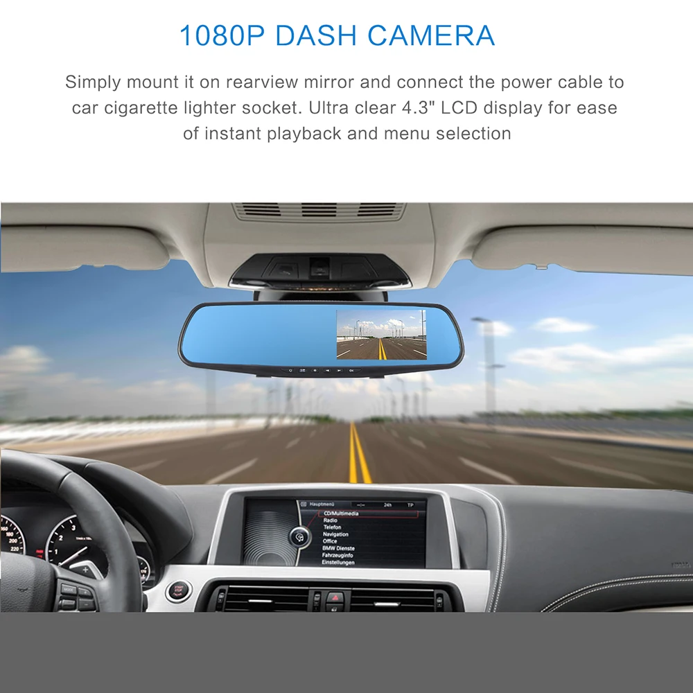 Просто установите его на зеркало заднего вида и подключите кабель питания к автомобильному прикуривателю. Ультра-прозрачная 4,3 "ЖК-дисплей дисплей для удобства мгновенного воспроизведения и выбора меню.