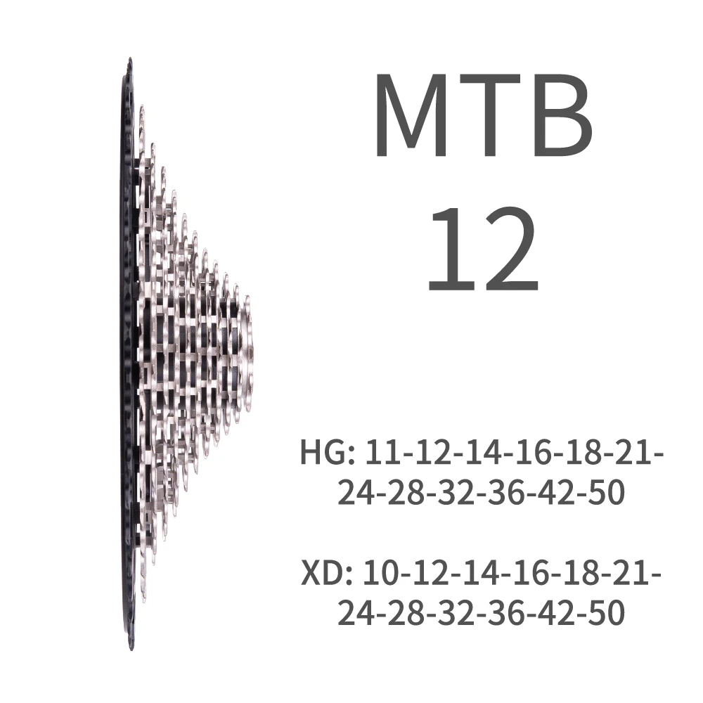 Совместимость 10-50T XD Совместимость 11-50T HG Материал: 1-й: ЧПУ из алюминиевого сплава 2 ~ 12: стальной CNC Вес: HG кассеты 359g/ XD кассеты 365g Диапазон: 10-50T/11-50T XD:10-12-14-16-18-21-24-28-32-36-42-50 HG:11-12-14-16-18-21-24-28-32-36-42-50 Цвет: серебристо-черный Подходит для: горного велосипеда