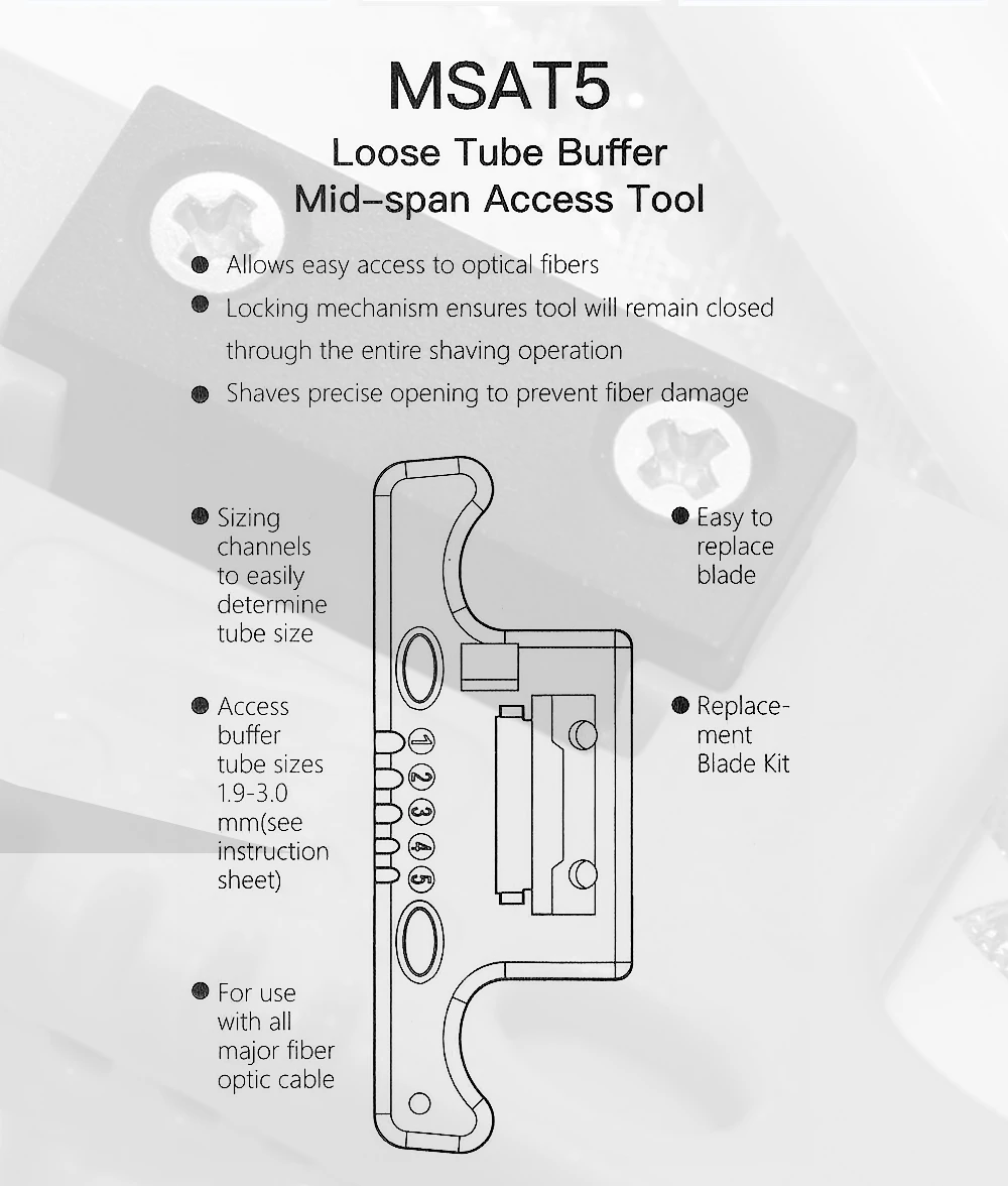 Инструмент для зачистки волокна с 5-канальным средним диапазоном, MSAT5 1,9-3,0 мм, инструмент для зачистки кабеля, бесплатная доставка Особенности 5 удобных встроенных измерительных каналов быстро определяют правильный диаметр канала для буферных трубок от 1,6 мм до 3 мм Механизм блокировки гарантирует, что инструмент останется закрытым во время работы Безопасный, компактный и эргономичный дизайн удобно лежит в руке для удобства эксплуатации Прочная полимерная Конструкция легкая и прочная