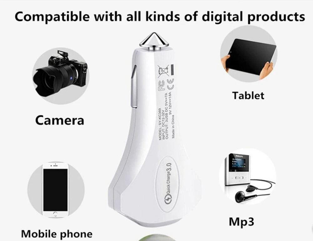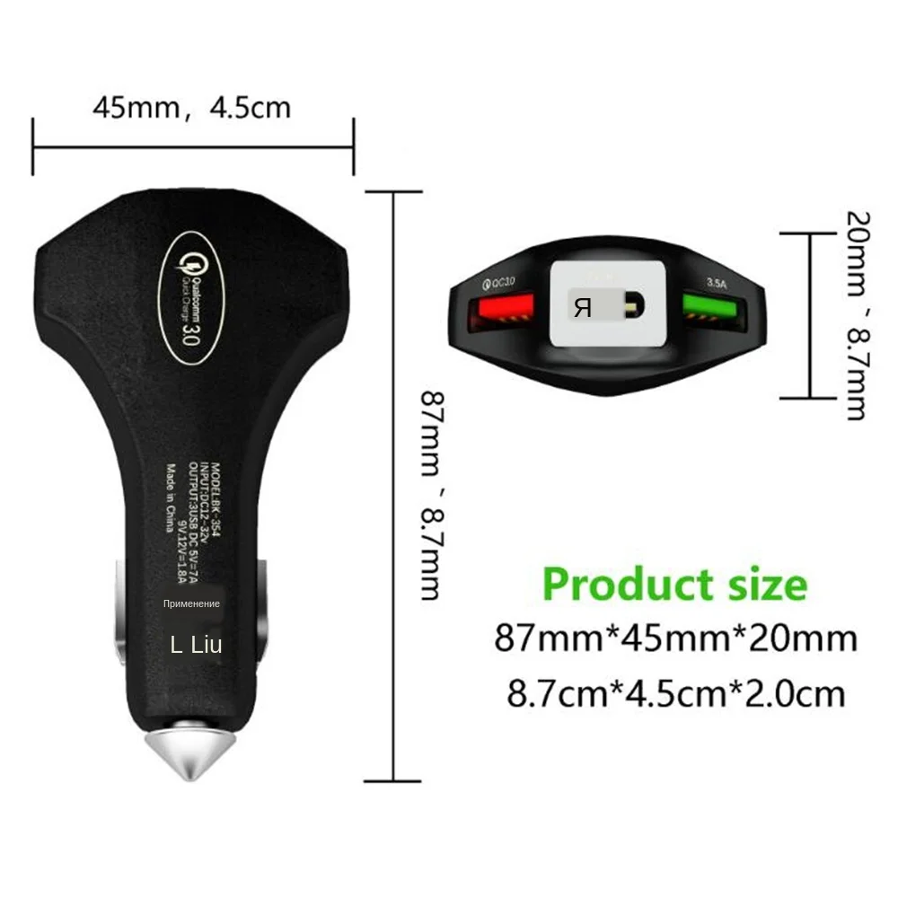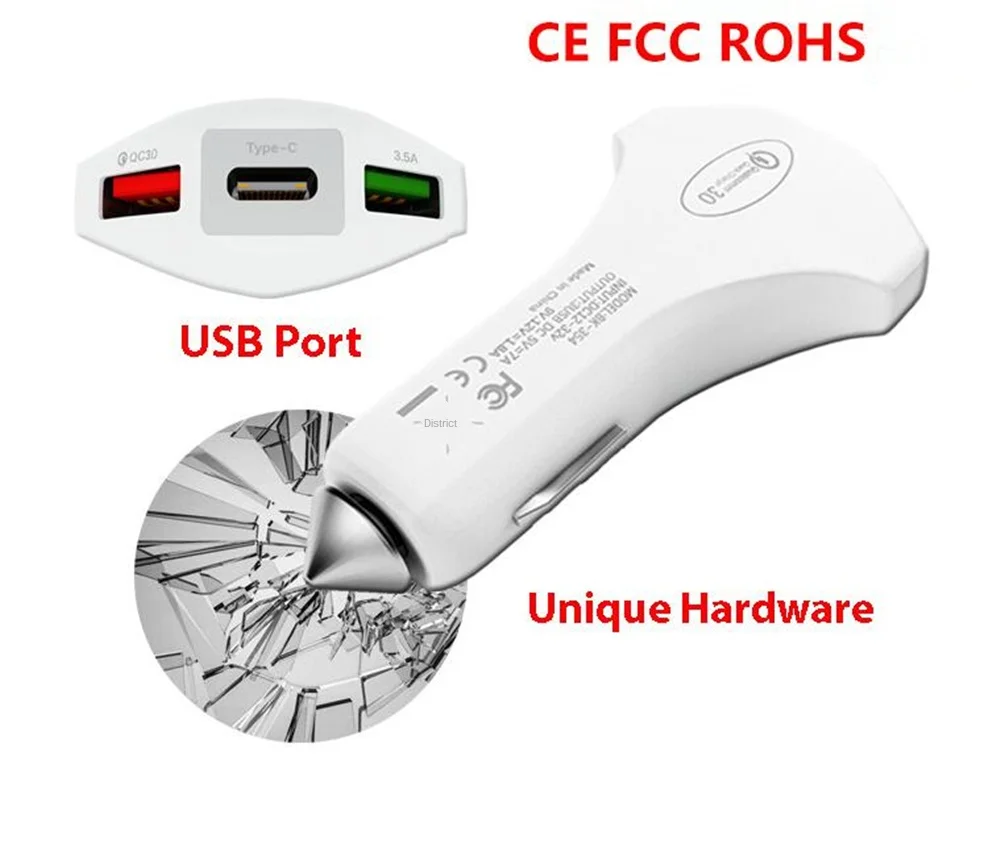 Подробная информация о продукте 1. Название продукта: type-C + Dual USB Автомобильное зарядное устройство безопасности молоток (QC3.0 Быстрая зарядка) 2. Материал изделия: PC огнестойкий материал 3. Вес продукта: 32 г (голый металлический вес нетто) 4. Размер продукта: 87 мм * 45 мм * 20 мм 5. Входные параметры: 12в-24в-32в, подходит для автомобилей, внедорожников, грузовиков. 6. Выходные параметры: порт QC3.0: 5 В/3.5A, 9 В/1.8A, 12 В/1.8A Тип-c делит ток 3,5а с общим usb-портом, интеллектуальный шунт Общий ток: 7000ма 7. Особенности продукта: оболочка принимает яркую оболочку и окислительную обработку, которая красива и не легко оставляет царапин; Интеллектуальное IC решение, интеллектуальное шунтирование, но не зарядка, автоматическая защита от отключения питания; Технология Quick Charge 3,0, обратная совместимость с QC2.0; Интерфейс type-c с кабелем передачи данных type-c-type-c, более быстрая зарядка; Для зарядки устройств, которые не поддерживают быструю зарядку, адаптивно распределяет большие токи для достижения быстрой зарядки