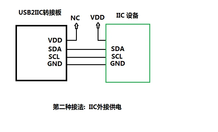 I2CWhen устройство не имеет внешнего источника питания, вы можете выбрать адаптер boardVDD (3,3 V)ToI2CEquipment источника питания, стоит отметить, что на этом адаптере boardVDDOnly200MADriving, IfI2CThe оборудование нуждается в большем количестве в настоящее время. Подключите к внешнему источнику питания, используйте второй метод подключения. Когда i2cкогда оборудование не нуждается в плате адаптера для питания, используйте второй метод подключения.