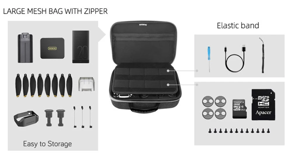 Этот продукт является Sunnylife специально дизайном для DJI Mavic Mini., с большой емкостью и может использоваться для хранения Mavic mini аккумуляторы с контроллером и другими аксессуарами. Может хранить до 5 батарей. Изготовлен из износостойкого материала.