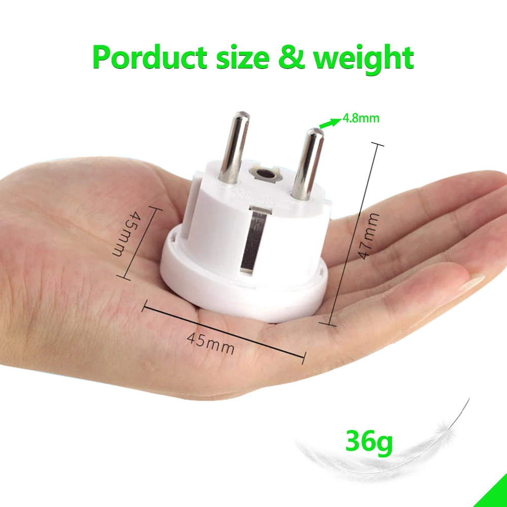 Название продукта: 4,8 мм штепсельная вилка европейского стандарта Разъем: два круглых штифта Преобразуйте вилку переменного тока всех стран в европейский стиль Компактный и легкий Электрическая Номинальная мощность: 250 В переменного тока 10 А. Подходит для Швеции, Греция, Египет, Норвегия, Корея, Германия, Чад, Венгрия, Индонезия (Бали), Франция, Mauritius, Испания, Финляндия, Нидерланды, Польша, Бразилия, Вьетнам, Португалия, Дания, Россия, Бельгия, Люксембург, Австрия, Чехия, Гана, Иран, Сирия, Ливан, Эль-Кувейте, Израиль, Дубай, Турцию, Чили, Парагвай, Латвию, Словению, Сенегалу, Болгарию, Хорватию, Габон, Экваториальную Зеландию, Камерун и другие регионы.