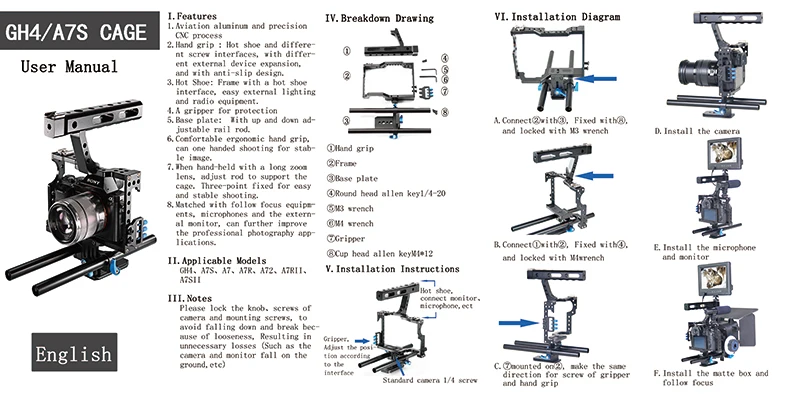 Профессиональная Алюминиевая DSLR камера видео клетка для Panasonic GH4 Sony Alpha A7 серии подходит для цифровых камер A7 A7II A7S A7SII A7R II Описание: Когда-нибудь было трудно одновременно установить несколько аксессуаров камеры на камеру? Вот отличный помощник для вас! Новая камера видео клетка, выглядит стройной, но изготовлен из прочных анодированных алюминиевых материалов, поэтому не будет легко страдать от коррозии или поломки. Это идеальный продукт для любителей и профессиональных фотографов. Он специально разработан для Sony A7 серии: Sony A7,A7II,A7s,A7r,A7Rii и для Panasonic gh4, чтобы обеспечить лучшее использование опыта, мы учитываем факторы. Эта клетка для камеры позволяет получить доступ к двери батареи, экрану и гнездам камеры. Очень легко установить и сломать, всегда готовы быть с вами. За исключением клетки, если вы не устанавливаете слишком много аксессуаров на монтажную планку наверху, его можно использовать в качестве ручки, чтобы поднять весь набор, когда он надежно соединен с помощью прилагаемого винта и шестигранного ключа. Кроме того, хорошо защищает вашу камеру, с множеством резьбовых отверстий, двумя металлическими холодными башмаками и системой стержней 15 мм, этот товар может помочь вам установить мигает микрофон, монитор, регистратор или другие аксессуары камеры на вашей камере в то же время, в результате чего расширение ваших установок на новый уровень. Особенности: Выглядит стройным, ощущается легким, но изготовлен из прочных анодированных алюминиевых материалов, поэтому не будет легко страдать от коррозии или поломки. Очень легко установить и сломать, всегда готовы быть с вами. Специально разработан для серии Sony A7: Для Sony A7,A7II,A7s,A7r,A7Rii и для Panasonic GH4 Эта клетка для камеры позволяет получить доступ к двери батареи, экрану и гнездам камеры Кроме того, хорошо защищает вашу камеру, с множеством резьбовых отверстий, двумя металлическими холодными башмаками и системой стержней 15 мм, этот товар может помочь вам установить мигает микрофон, монитор, регистратор или другие аксессуары камеры на вашей камере одновременно Хорошо защищает камеру во время использования Технические характеристики: Материалы: Алюминий из алюминиевого сплава Клетка для серии Sony A7: Для Sony A7,A7II,A7s,A7r,A7Rii и для Panasonic GH4 Посылка Содержание: 1 x Камера клетка (Камера не входит в комплект)