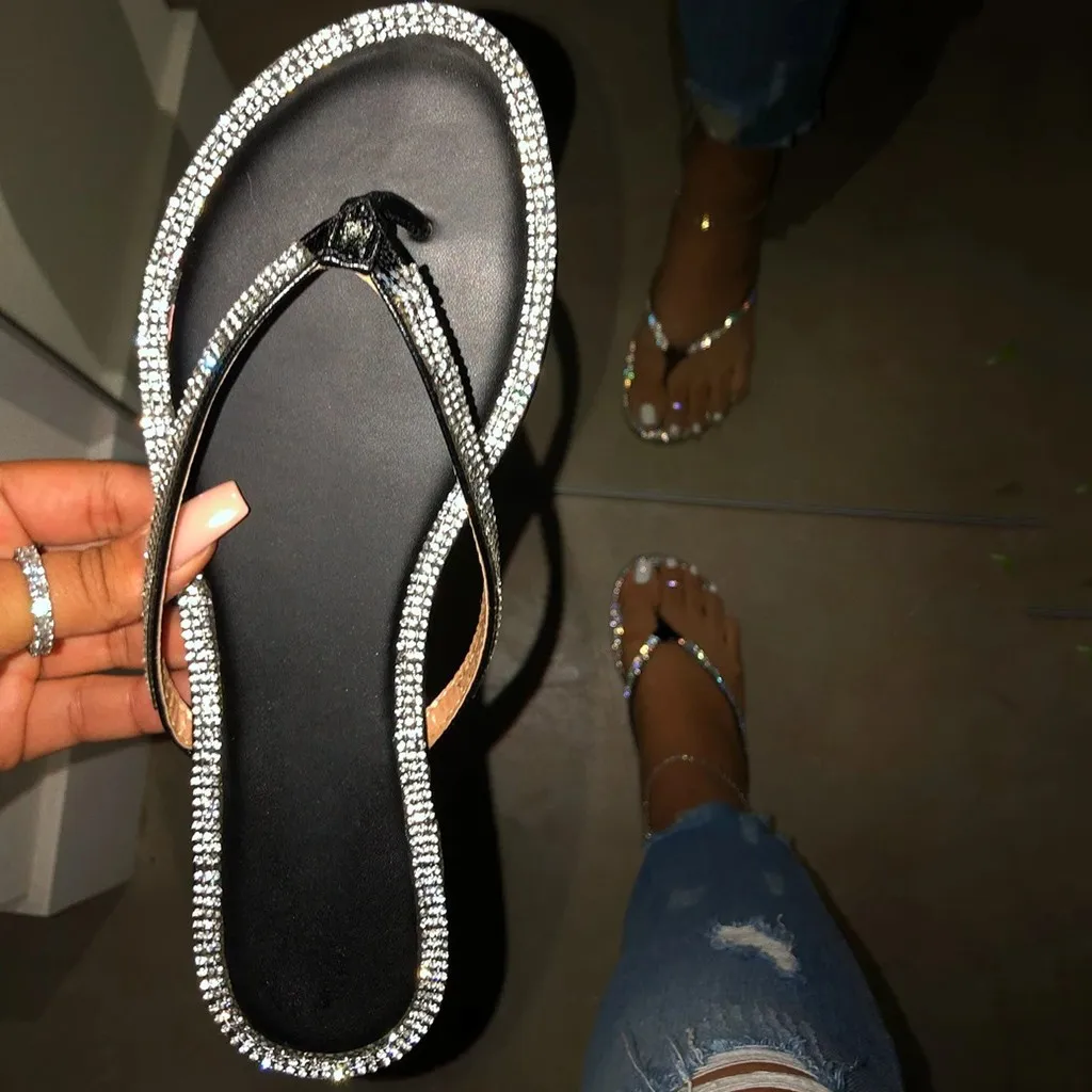 Jaycosin/Модные женские босоножки; Летние шлепанцы; Обувь на плоской подошве; Женские шлепанцы с кристаллами; Стразы; Блестящие вьетнамки