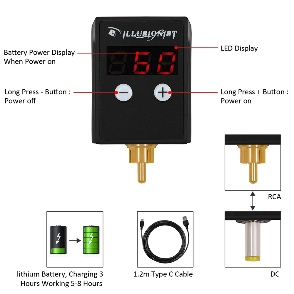 1.W-Li источник питания для светодиодного цифрового дисплея встроенные литиевые батареи могут быть переработаны для высокой эффективности и экономии энергии, зарядка около 3 часов, с мотором около 5-8 часов. 2. Долгое нажатие + клавиша 0,8 секунд для запуска, долгое нажатие-клавиша 0,8 секунд для выключения, +-клавиша каждый раз, когда 0,1 в передача. Срок службы батареи: 5 ~ 8 часов Вес: 68,5 г Размеры: на возраст размер на 4*2,9*3,6 см Тип зарядки: RCA/DC Время зарядки: 2-3 часа Время работы: 5-8 часов Рабочее напряжение: 4 ~ 11 в Комплект поставки: 2 шт. блок питания + 2 шт. USB кабель (Ручка не входит в комплект)
