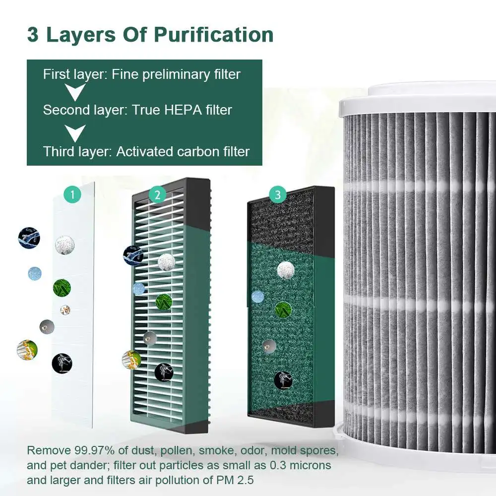 *3 Powerful Filters* : This Tower Purifier employs a fine preliminary filter, true HEPA filter, and activated carbon filter to effectively remove 99.97% of dust, pollen, sme, odor, mold spores, and pet dander; filter out particles as small as 0.3 microns and larger and filters air pollution of PM 2.5