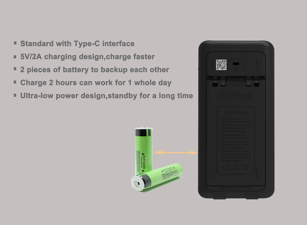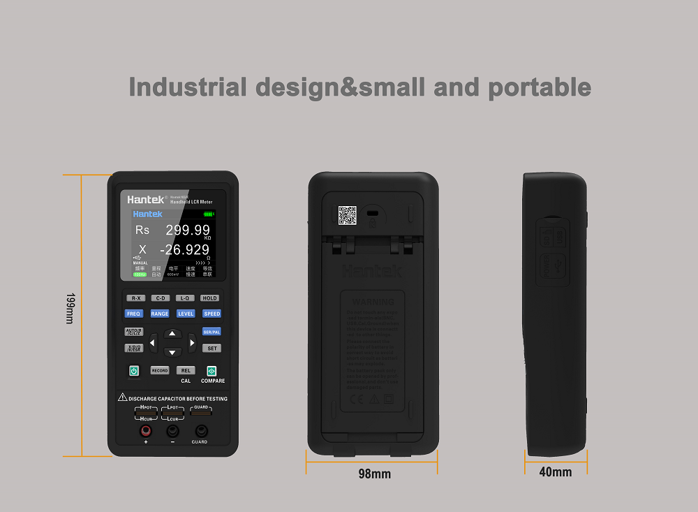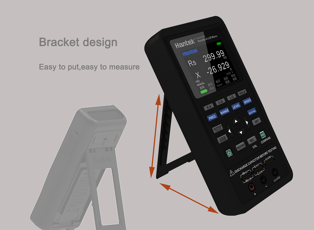 1.100Hz, 120Hz, 400Hz, 1kHz, 4kHz, 10kHz, 40kHz, 50kHz, 75kHz, 100kHz 10 typical test frequency (Hantek1832C) 7 typical test frequency 2.2.8 inch TFT LCD, Switch between Chinese and English 3.HD display, dual display of measurement data, the result is clear 4.Support data record analysis 5.Support PC upper computer, easy to control and measure remotely 6.Test lead: 3 terminal/5 terminal switch 7.Measuring speed: high speed/intermediate speed/low speed switch 8.Range: support manual/auto switch, easy to do quick measurement 9.LCR adopted rechargeable design, Large capacity lithium battery, super standby 10.Double shock protection sleeve, all-round protection, shakeproof, fall-arrest, protect the machine from damage, longer use time, more comfortable measurement 11.Bracket design, easy to put and measure Package Including 1xLCR machine 1xHandbag 1xShort circuit card 1xCertificate of quality 1xRed-black alligator clip cable 1xType-C adapter Model Hantek1832C Hantek1833C Test frequency100Hz, 120Hz, 400Hz, 1kHz, 4kHz, 10kHz,
