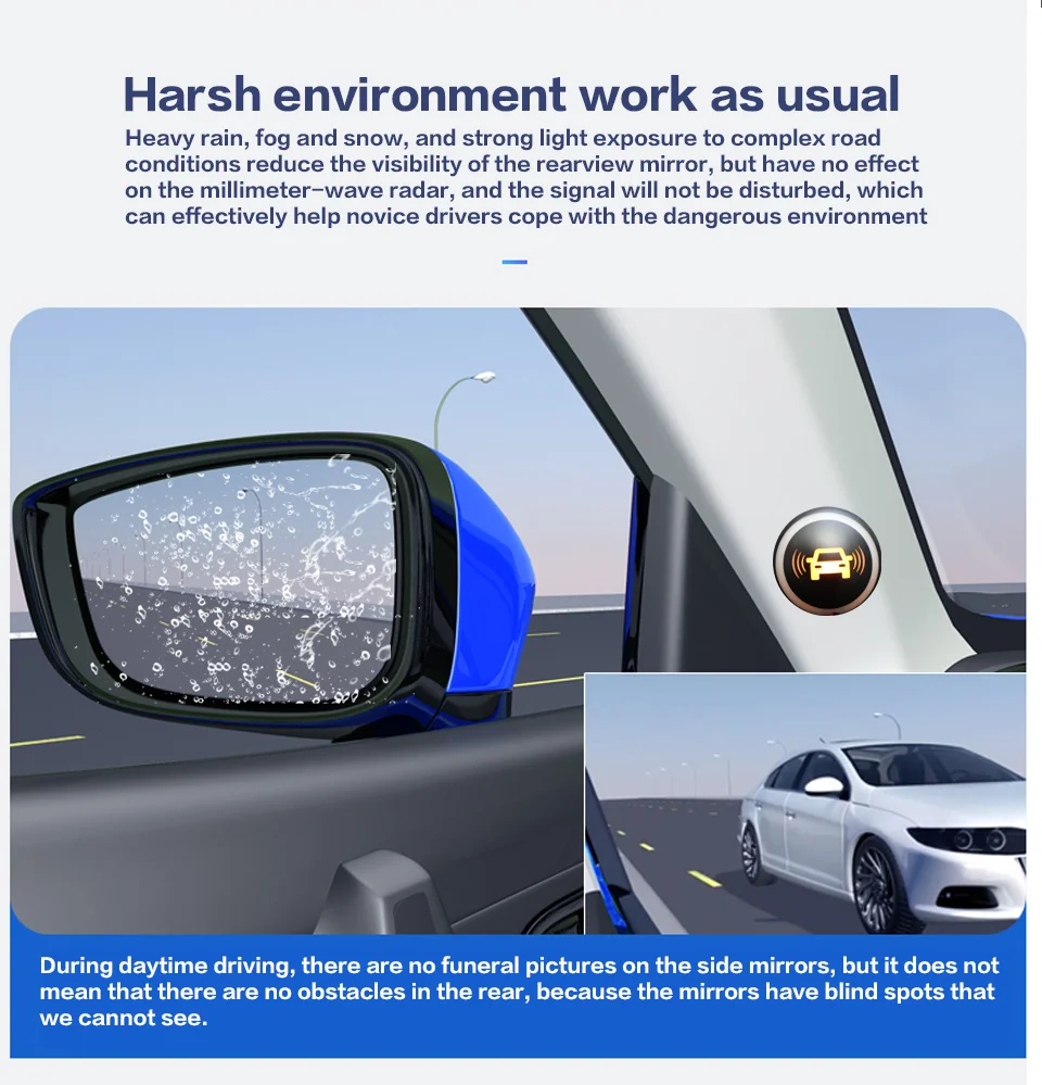 4. В задней части транспортного средства есть слепая зона, которая легко подвергает опасности безопасность вождения.! Когда вы вставляете светодиодный BSM в вашу прекрасную машину, независимо от того, что это день, ночь или даже снег, вы может быть предупреждены в тех случаях, когда есть движущегося объекта поп в задней части автомобиля, с помощью светодиодный освещение на солнечной, мигание, Звуковой сигнал, чтобы водитель мог быть осторожным при смене полосы движения, чтобы избежать возможности бокового аварии.