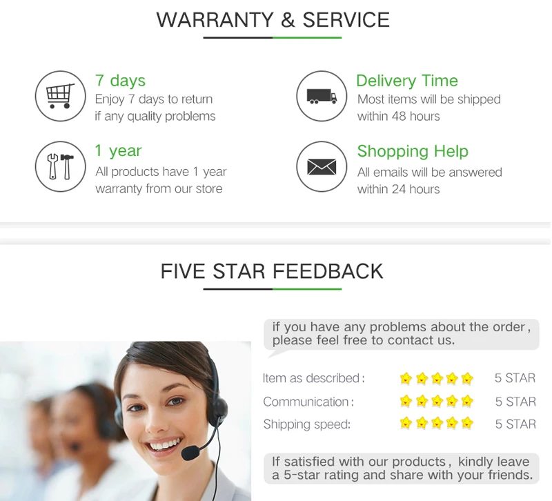 1. Вы можете получить гарантию на год в нашем магазине 2. Принимаются возвраты. Товар должен быть в первоначальном состоянии. И вы должны оплатить дополнительные расходы по доставке, и возвращенные товары должны храниться в их первоначальном состоянии.