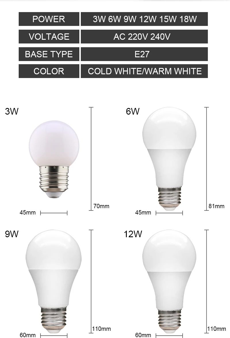 6 шт. E27 светодиодная лампа 3 Вт 6 Вт 9 Вт 12 Вт 15 Вт 18 Вт AC 220 В 240 В Bombilla лампада СВЕТОДИОДНАЯ Лампа Холодный/теплый белый домашний светодиодный прожектор