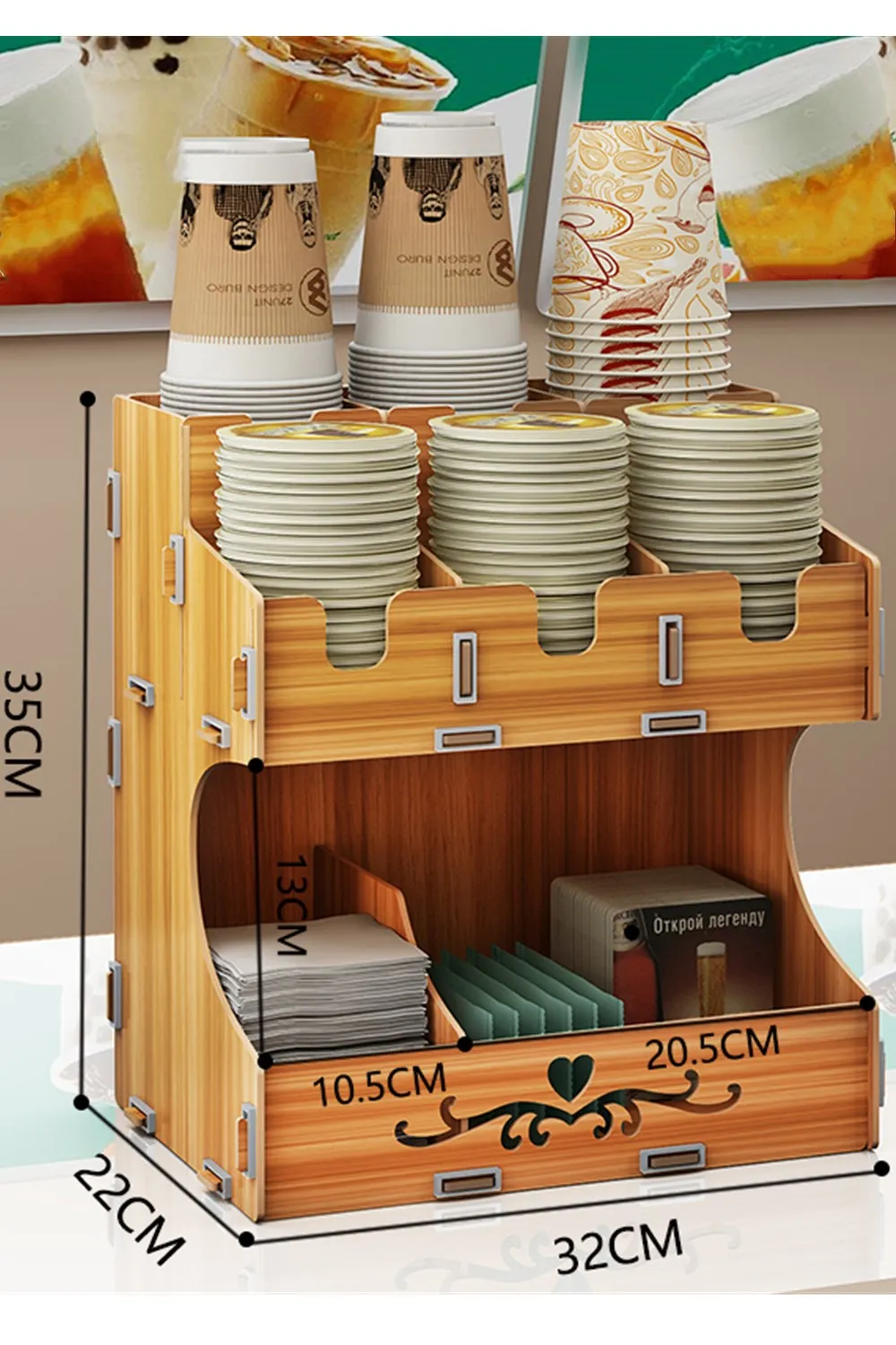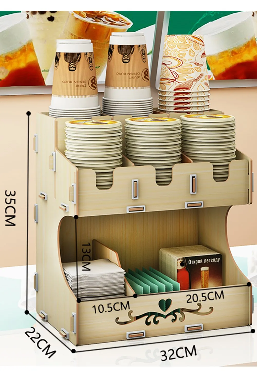 Сделай сам, простая сборка Согласно инструкциям, приведенным в изделии, каждый может завершить монтаж в течение 15 минут, что очень забавно для его сборки. Резиновое кольцо пристегивается для укрепления органайзера. Высококачественный материал для деревянных ДСП Выберите высококачественную и экологичную деревянную ДСП толщиной 3 мм с гладкой поверхностью. Нетканый одноразовый держатель для чашек является твердым, прочным, а материал изделия также является коррозионно-стойким и водонепроницаемым. Кофе чай или напитки бумажная чашка/крышка, питьевые соломинки могут храниться в держателем Держатель имеет несколько отделений, размеры отделов-10 см х 10 см. Одноразовый держатель для чашек предназначен для кофейни, молочного чая, бара, ресторана и дома. Это может помочь людям работать более удобно и эффективно. Это также сделает рабочее место новым, более чистым и стройным.