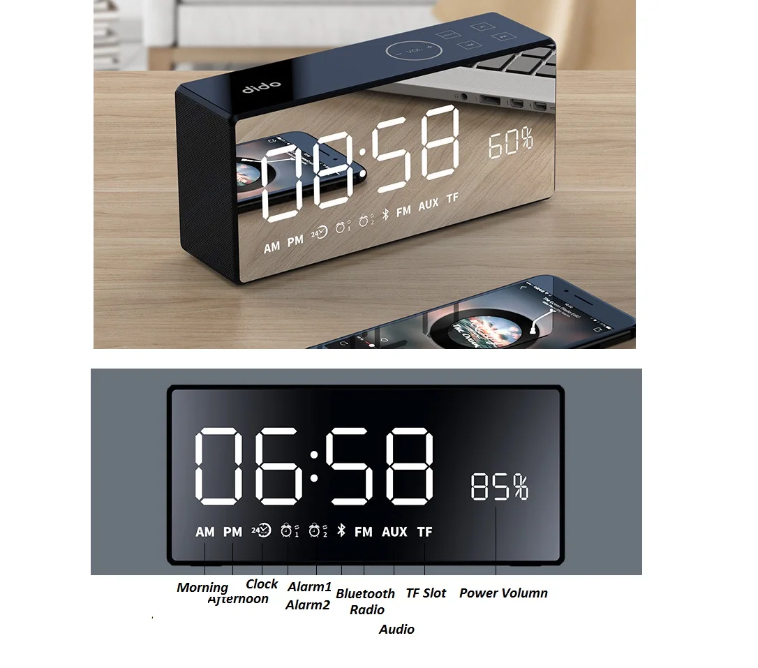 Bluetooth-динамик HXY X9 добавляет модную ЖК-панель, которая может использоваться в качестве часов и будильника. Экран может регулировать три уровня яркости. Он также может выключить часы для воспроизведения музыки. 2032 кнопочных батарей встроены в нижней части динамика. Даже если питание динамика выключено, установленное время может быть сохранено, даже если аккумулятор используется или питание выключено. Новый установленного времени.