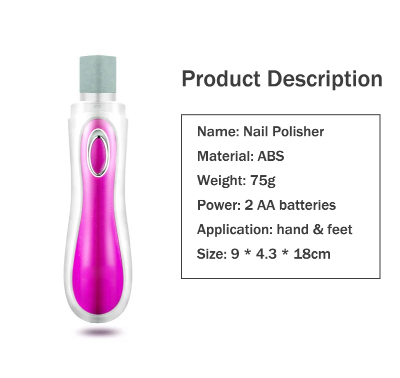 Включает в себя набор из 5 сменных роликов для подачи, полировки и сияющих ногтей, а руководство для подачи используется в целях безопасности во время шлифовки края ногтя. Очень простой в использовании полировщик для ногтей. Без лака. Не содержит химических веществ. Никаких проблем. Без запаха. Быстро достичь красивых привлекательных натуральных ногтей. Профессиональный салонный результат длится до 2-3 недель. Работает с 2 батареями АА. Небольшая дорожная сумка хранит все предметы внутри, чтобы вам было удобно переносить прибор для ухода за ногтями куда угодно. Эргономичный дизайн обеспечивает безболезненное, гладкое ощущение на ладони во время работы по уходу за ногтями. Прекрасный Рождественский подарок!