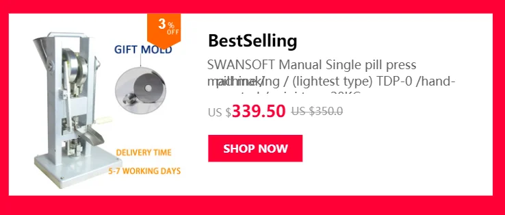 Эта машина проста в использовании, небольшая по размеру и легкая по весу. Эта машина является только парой штампов (может заменить круговую или другую форму специальной формы), глубина наполнения материала и толщина планшета и вес регулируется, может адаптироваться к запросу фармацевтической промышленности к угнетению, западной медицине таблетки и другие отрасли для подавления требований различных похожих продуктов, Оборудование для чистого ручного листа штамповки машины, мотор, скорость таблицы согласно личной скорости руки, автоматическая подача, ручной свет, низкий уровень шума, легкий вес.