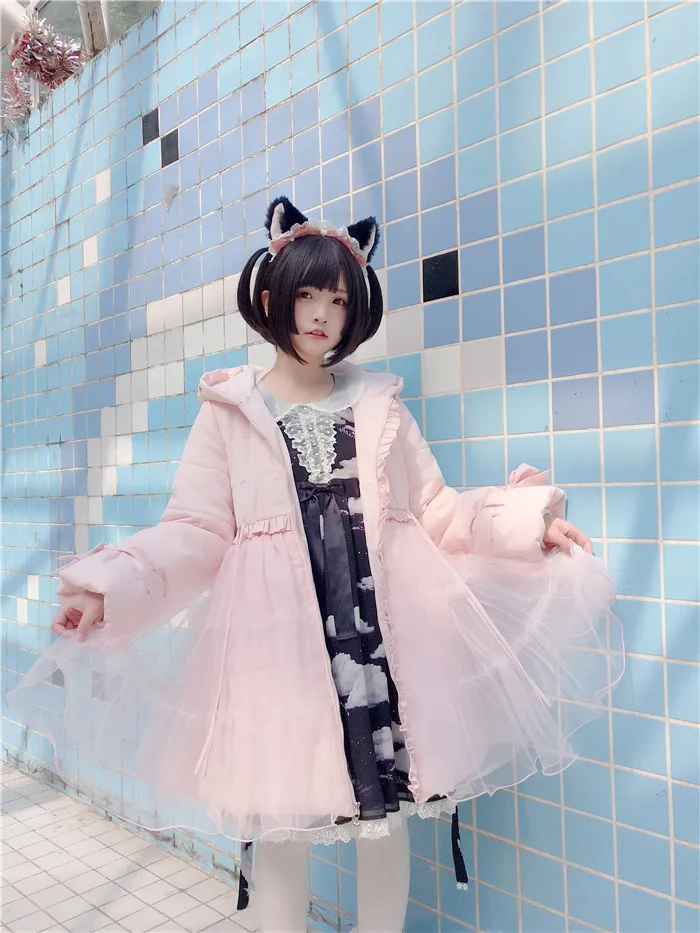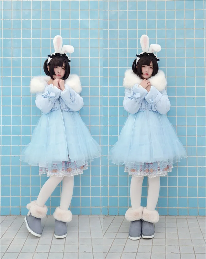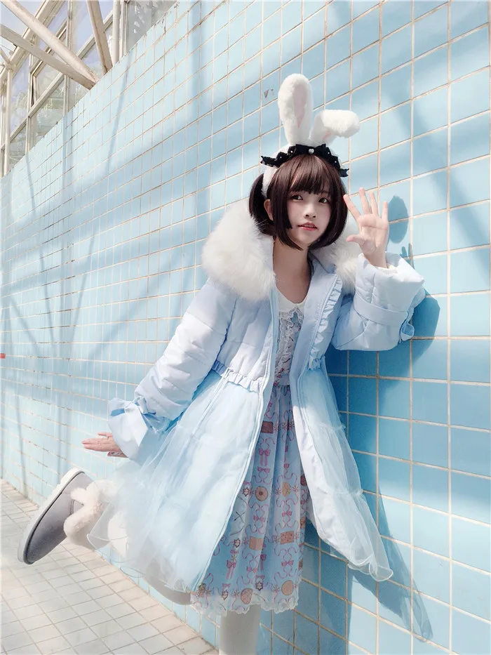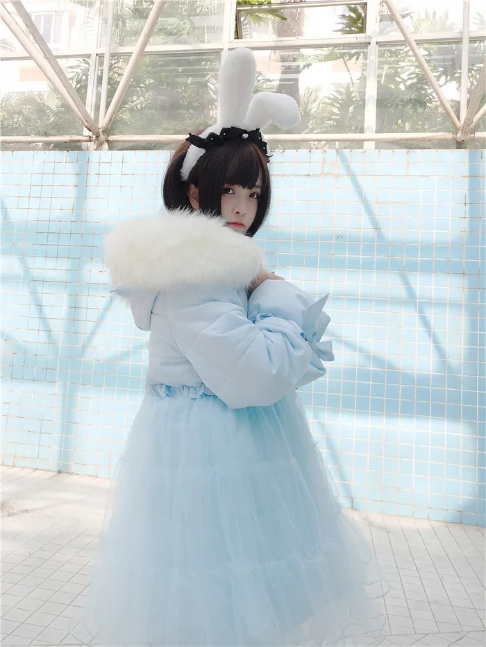Зимний сетчатый пуховик с большим меховым воротником, теплое пальто принцессы в викторианском стиле, kawaii, готический Топ в стиле Лолиты для девочек, колледж