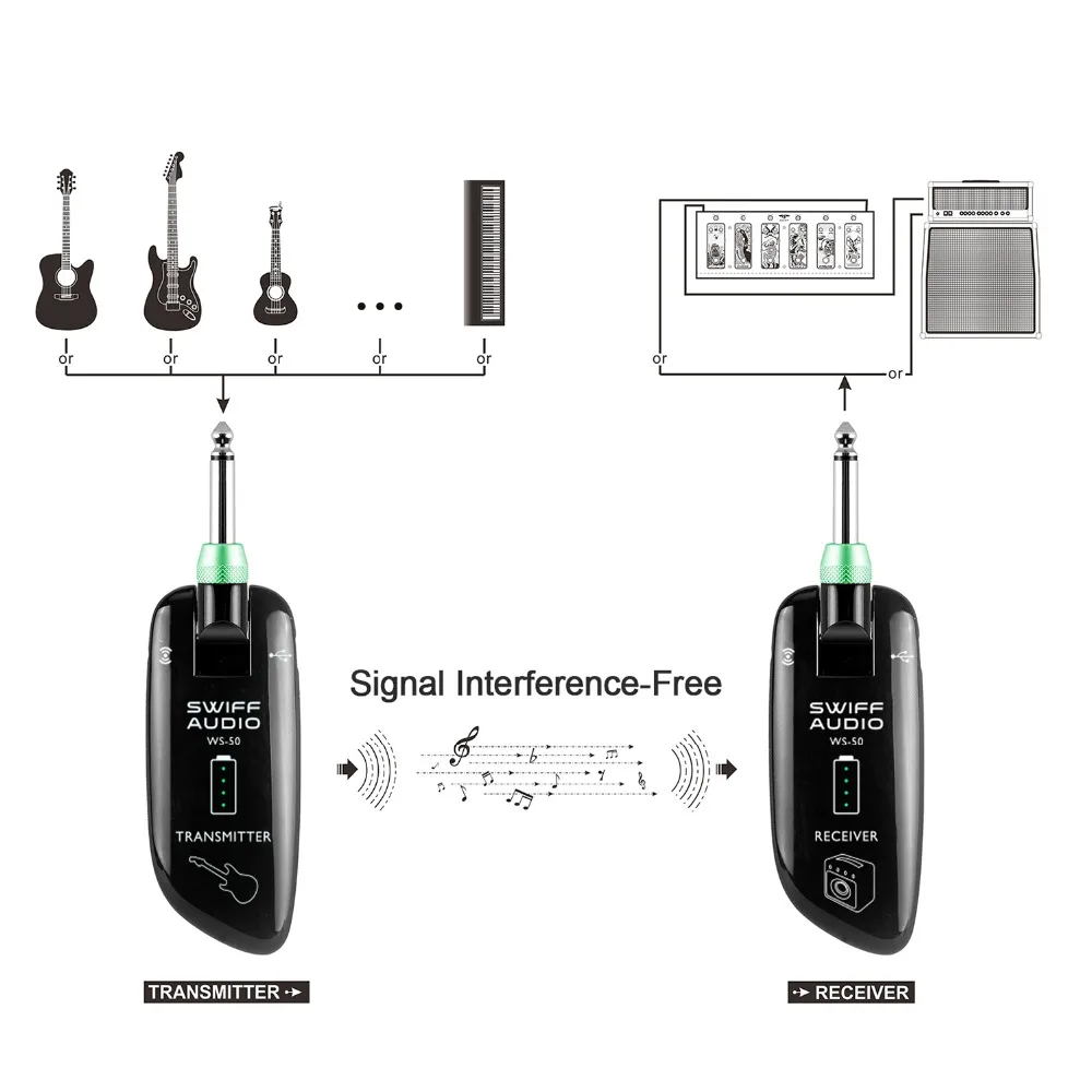 WS-50 использует цифровую радиочастотную технологию беспроводной передачи. Благодаря сильной противоинтерфейсной способности и стабильной передаче сигнала, он идеально подходит для сцены гитар или басов.