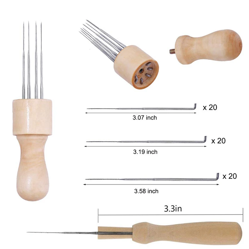 Шило x1 Ножницы x1 Игл Бутылки x3 3 дюймовые иглы для валяния x8 3,07 дюймовые иглы для валяния x20 3,19 дюймовые иглы для валяния x20 3,58 дюймовые иглы для валяния x20 Деревянная ручка для валяния x2 Коврик из пены для валяния x1 Кожаная пальчиковая кроватка (случайный цвет) x2