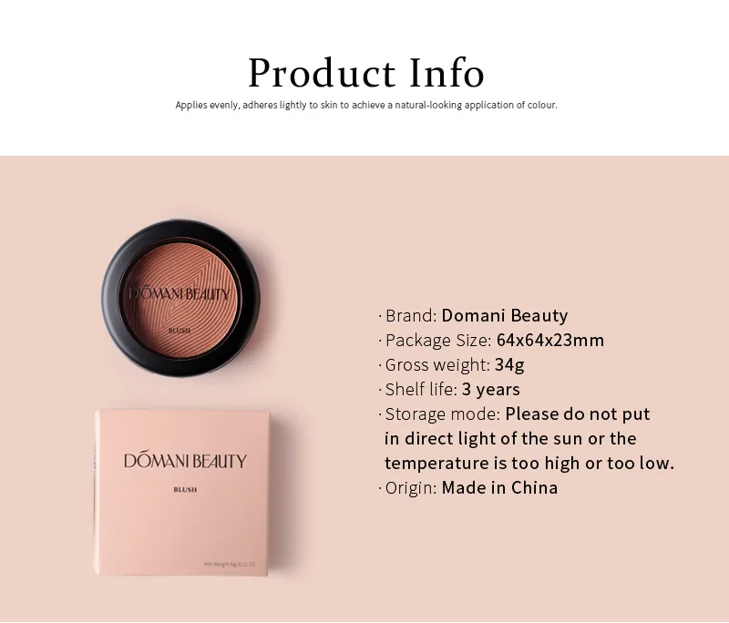 Информация о продукции Наносится равномерно, слегка прилипает к коже для достижения естественного нанесения цвета Бренд: DOMANI Размер посылка: 64*64*23 мм Вес брутто: 34 г Срок годности: 3 года Режим хранения: пожалуйста, не помещайте в прямой светильник на солнце или температура слишком высокая или слишком низкая Происхождение: Сделано в Китае Фантастические Румяна равномерно наносятся