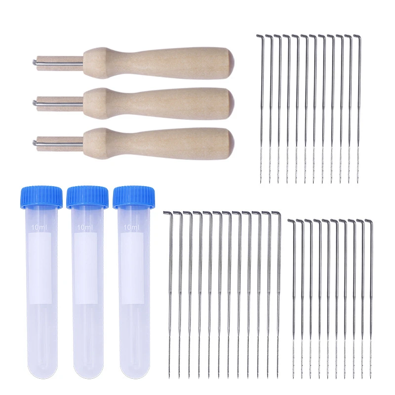 Область применения: игольчатый войлок Способ использования: после фиксации шерстяной ленты проткните вертикально иглой, чтобы избежать поломки иглы. Товар: 10 тонких иголок + 10 средних иголок + 10 толстых иголок + 3 больших синих флакона + 3 деревянных штампа Упаковка: Opp мешок