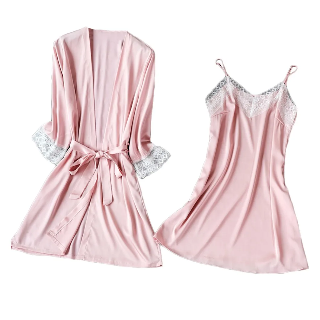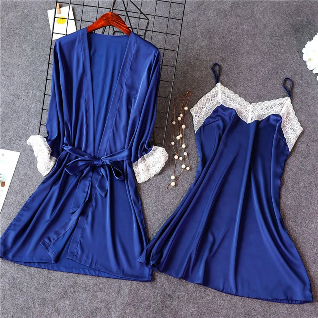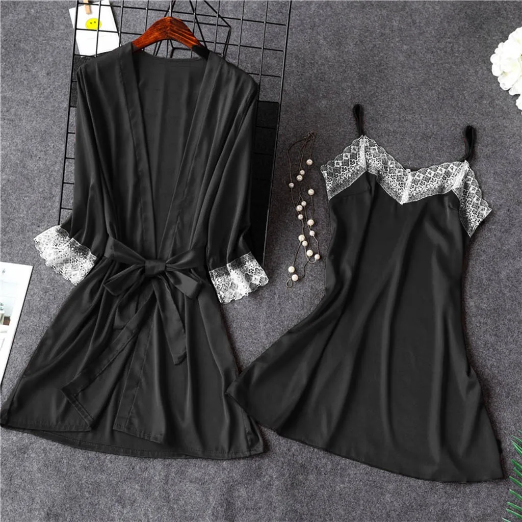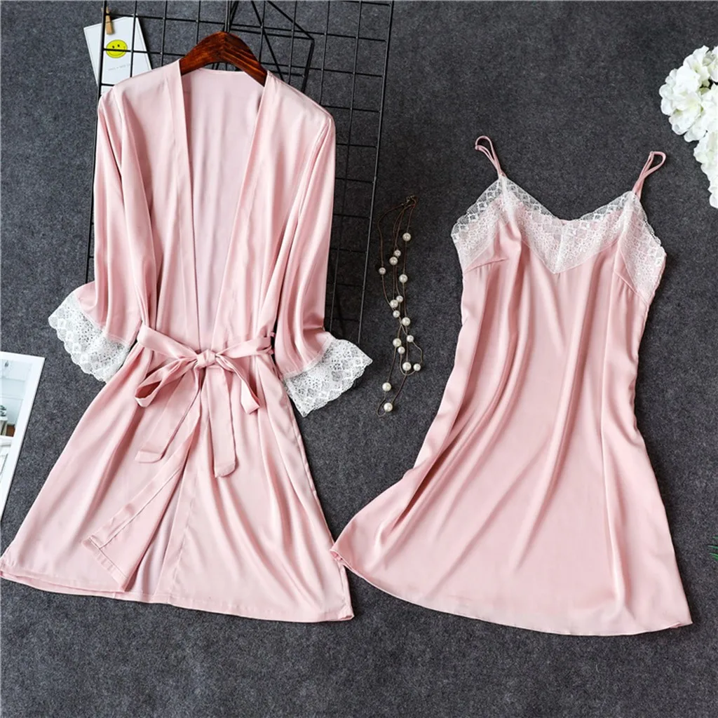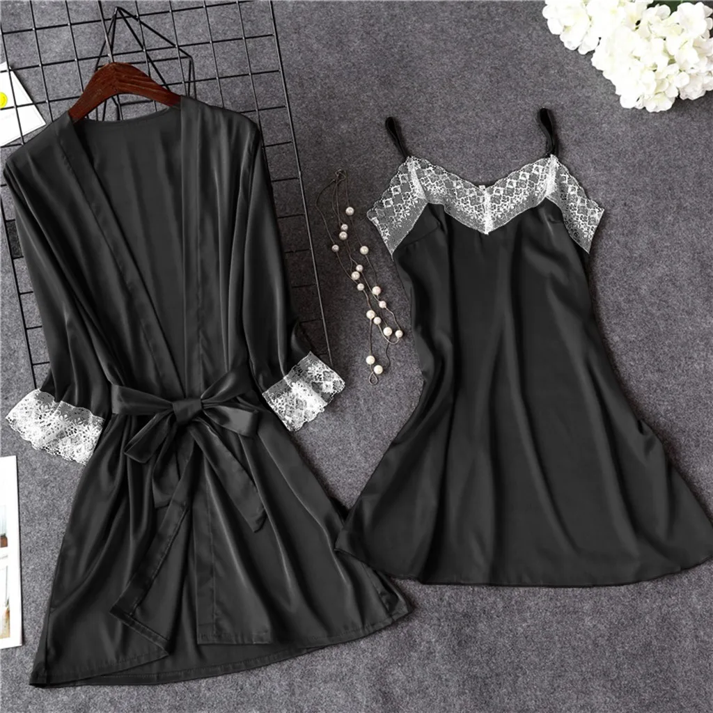 2 шт. Женская кружевная атласная пижама банный халат белье пижамы Ночная рубашка нижнее белье