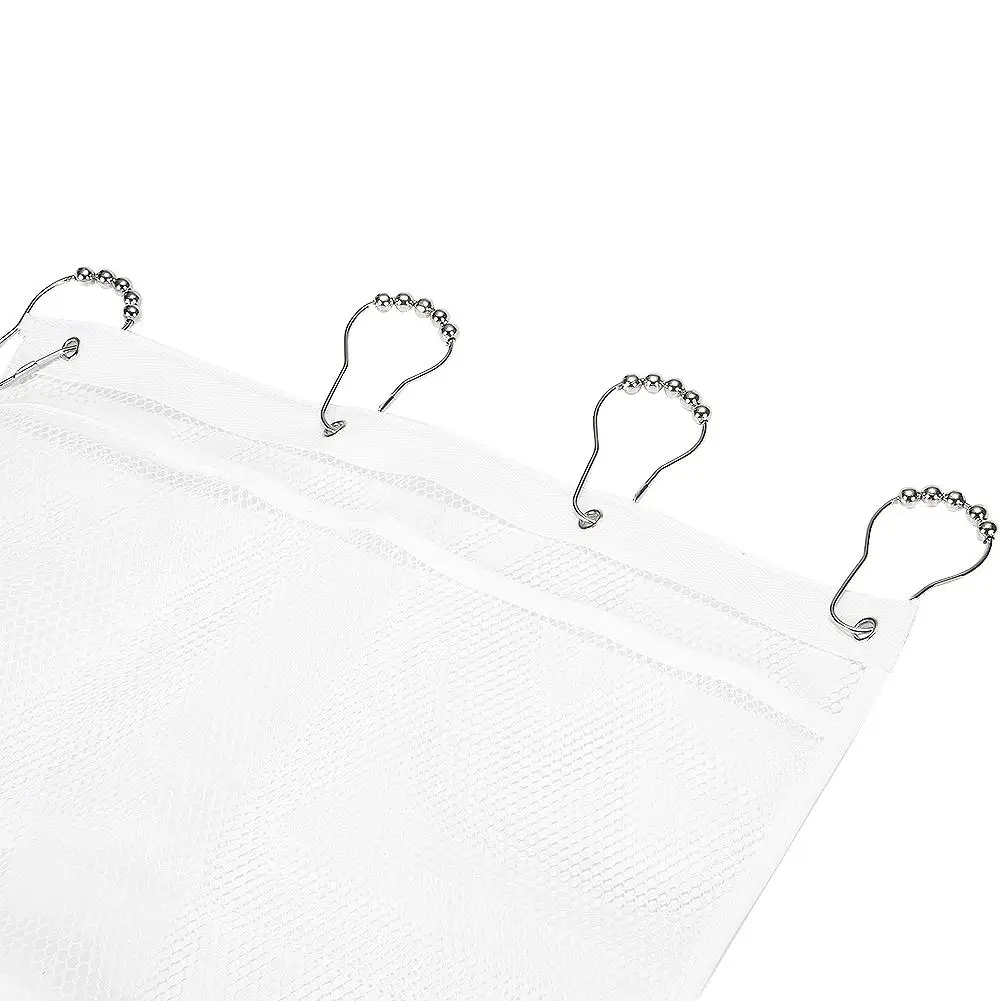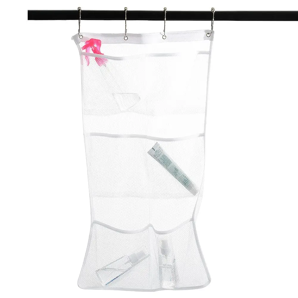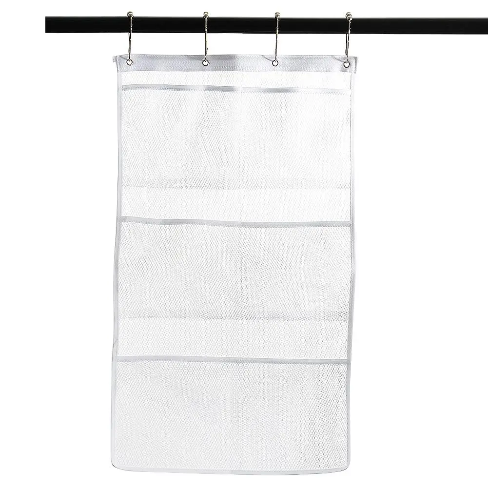 Если повесить на занавеску, вы можете открыть кольца для душевой занавески и продеть сетчатый Органайзер через кольца.