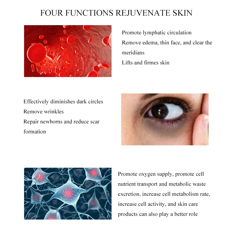Ускоряет кровообращение капиллярного сосуда и повышает проницаемость клеток, чтобы питательные вещества более эффективно доставляли коже и мышечной ткани. Микроток, генерируемый этим аппаратом, может проникать в глубокий слой кожи для пополненияВода для восстановления влажной, гладкой и нежной кожи.