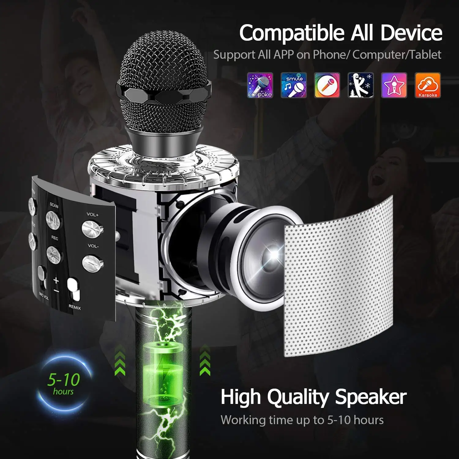 [Хорошая звуковая колонка]-с профессиональными аудиопроцессорами, системой настройки и 3 уровнями шумоподавления, усиление было хорошим и четким, а также громкость. Вы можете использовать любое приложение для караоке, пойте вместе с вашими любимыми музыкантами или даже смотреть музыкальные видео на YouTube, чтобы поять вместе! Давая вам все выступления. [Веселый микрофон для караоке]-Забавный микрофон с танцевальными лампами. Огни красивые и яркие, но не ослепляющие, и они прыгают с музыкой. Особенности смены голоса Веселые! Это оригинальный голос, детский голос, женский голос, мужской голос. Перезаряжаемый аккумулятор емкостью 1800 мА · ч позволяет прослушивание музыки в течение 12 часов или 4 часов в режиме полной зарядки. Не слишком тяжелый и беспроводной. Можно взять в любом месте для мгновенного караоке, вечерние. Вы будете наслаждаться пением с помощью этого необычного микрофона! [Легко использовать]-все, что вам нужно сделать, это подключиться через Bluetooth, установив его на телефоне или ipad, а затем перейти на YouTube. Простое подключение к любым устройствами, включая телефоны Android iOS, ПК, ноутбуки и приложения. Прием Bluetooth является стабильным, а Расстояние соединения-до 10 м. [Лучшие подарки]-этот микрофон красиво сконструирован и имеет много различных видов применения, давая каждому человеку большой музыкальный опыт. Подходит для тех, кто любит петь. Детям не только нравится, но и взрослые. Отличный подарок на Рождество, день рождения, вечерние мероприятия, свадьбы, День отца, День матери, День Святого Валентина и другие праздники.