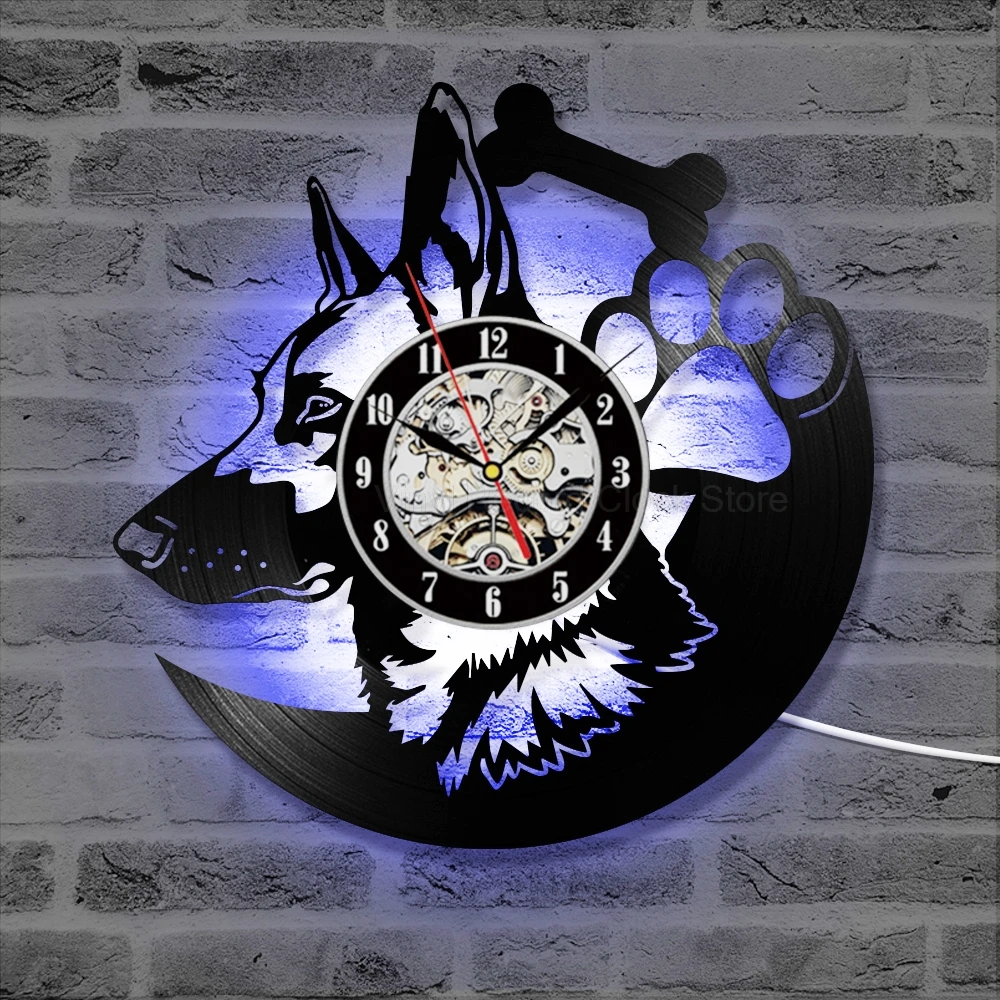 Немецкая овчарка Собака часы светящиеся светодиодные часы для гостиной виниловая запись Висячие Часы Освещение Amimal декор комнаты
