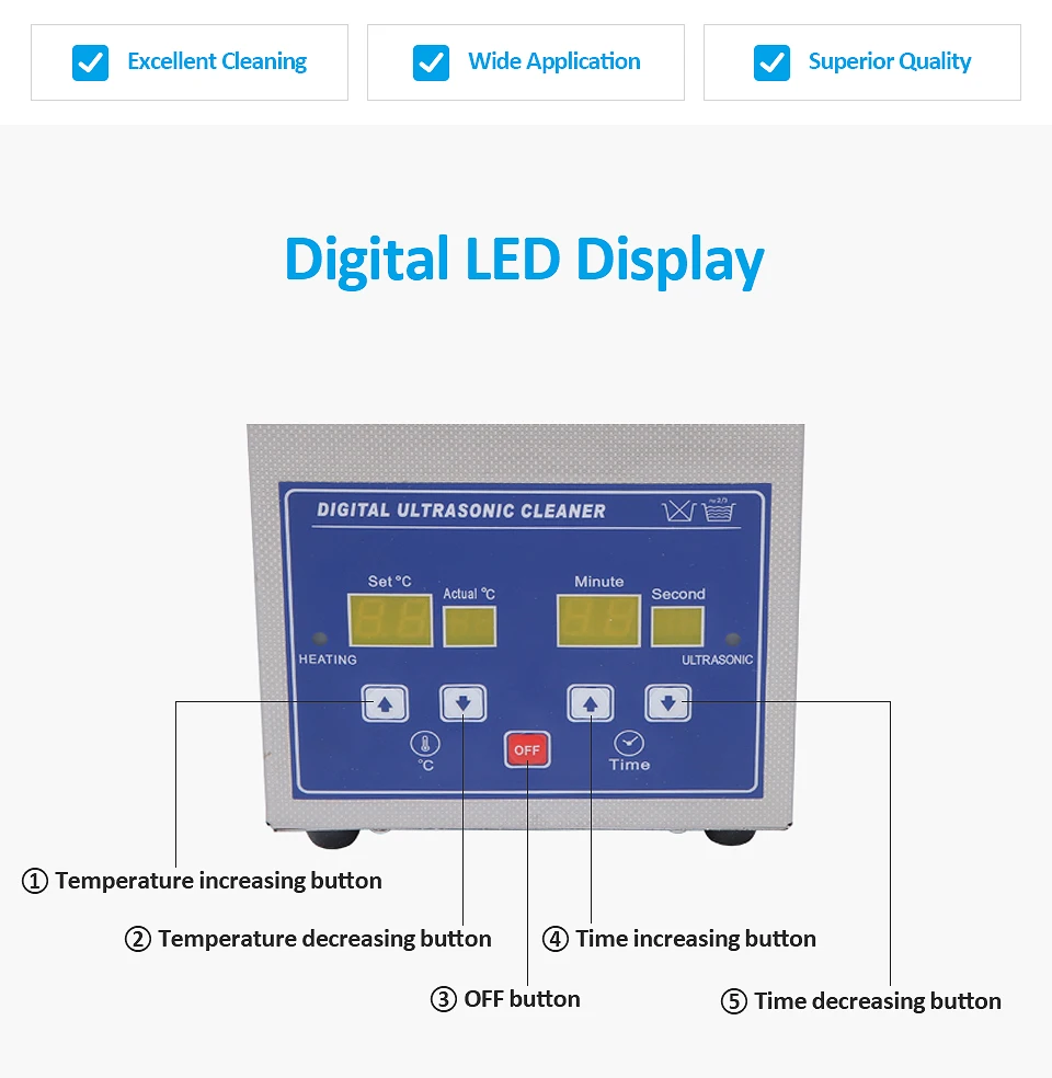 1. Высокомощный преобразователь для превосходного качества очистки 2. Цифровой светодиодный дисплей 3. Время: 1-30 минут и температура: 1- 80 ℃ 4. Материал: SS304 для аквариума, корпус, крышка и корзиной для очистки 5. Отличная водонепроницаемость
