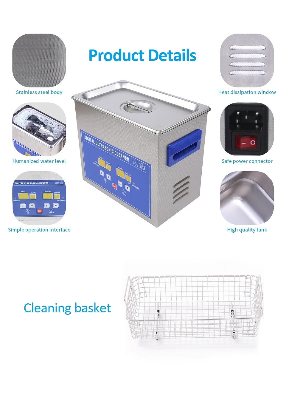 1. Высокомощный преобразователь для превосходного качества очистки 2. Цифровой светодиодный дисплей 3. Время: 1-30 минут и температура: 1- 80 ℃ 4. Материал: SS304 для бака, корпуса, крышки и чистки корзины 5. Отличная водонепроницаемость