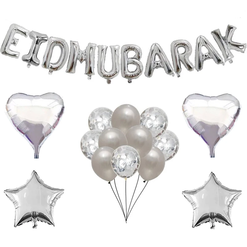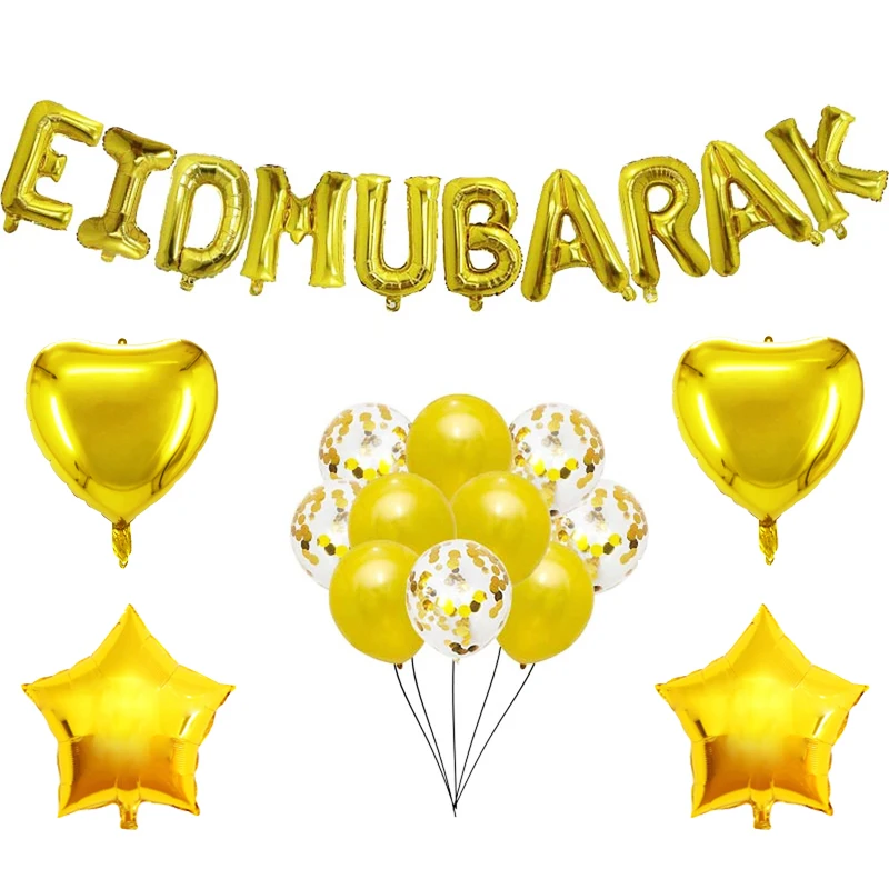 100% абсолютно новая и высококачественная алюминиевая пленка Особенности: Воздушные шары изготовлены из хорошей алюминиевой пленки, поэтому их легко надувать, что позволяет быстро создать веселую атмосферу праздника. Технические характеристики: Название продукта: воздушный шар ИД Мубарак Материал: алюминиевая пленка + латекс Размер: 16 дюймовые фольгированные шары Цвет: золотой, серебряный, розовое золото (опционально) Количество: 1 комплект ИД Мубарак, 14 шт. В комплект входит: 2 love heart (18 ", фольга) + 2 звезды (18", фольга) + 5 конфетти латекса (12 ") + 5 цветов латекса (12")