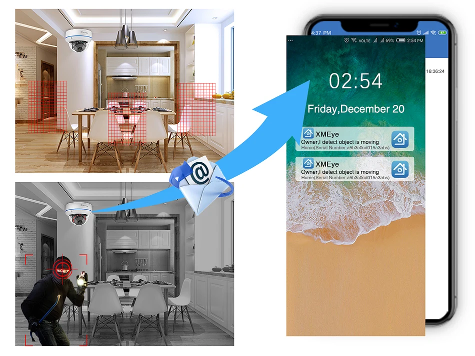 Когда кто-то врезается в область съемки, сообщения тревоги будут доставлены в ваше приложение